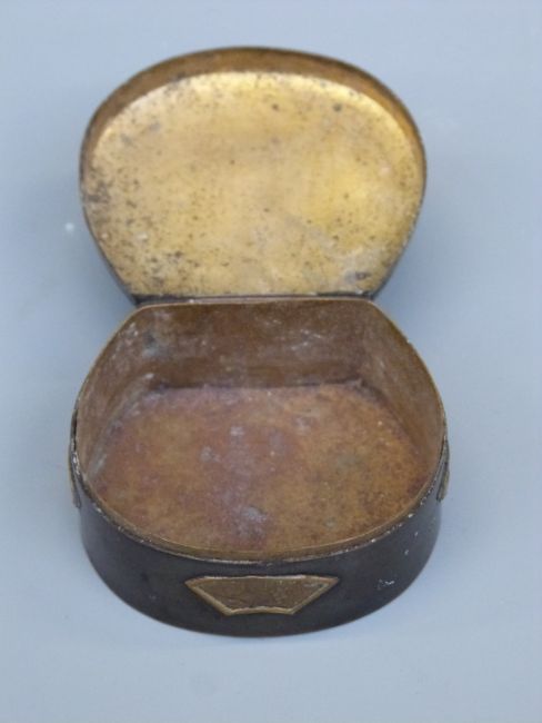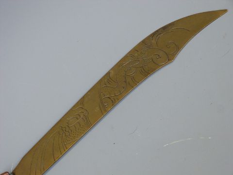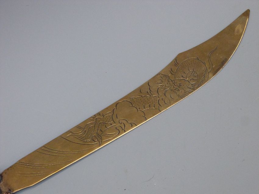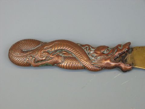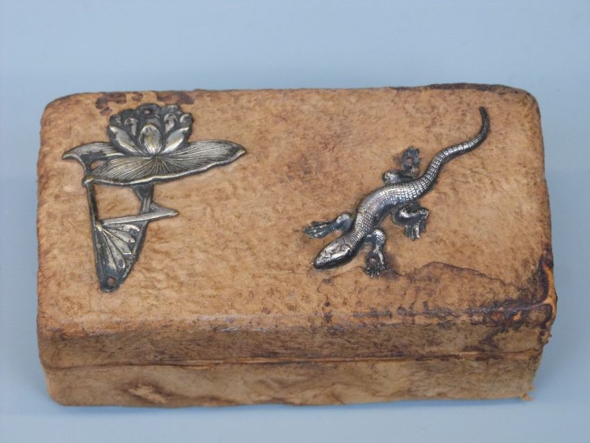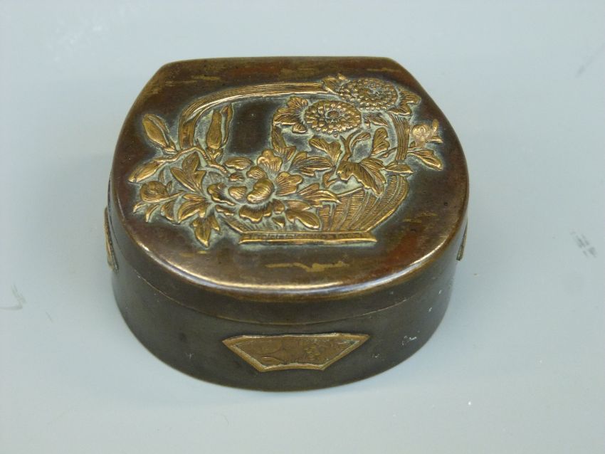 A Japanese lidded box, dragon-handled letter opener and a stamp box with white metal lizard and lotus flower mounts