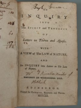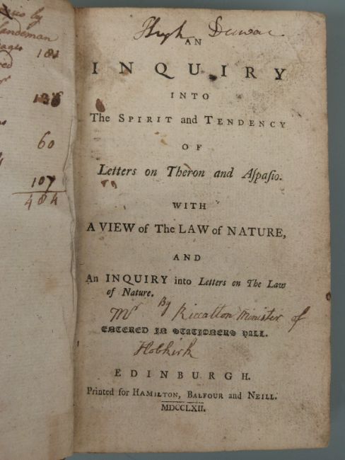 [Robert Riccaltoun] An Inquiry into The Spirit and Tendency of Letters on Theron and Aspasio with a View on the Law of Nature, Edinburgh printed for Hamilton, Balfour & Neill, 1762 bound with A Discourse wherein the Oneness of the Divine Essence in the Holy Trinity is defended 1722, Remark on Professor Simson's first Libel… 1729, The Proper, True and Supreme Deity of our Lord and Saviour Jesus Christ 1736 with copy of Les Jeunes Amis by Mme Elisabeth Griffin, Paris 1825 containing several engravings and a volume of Buchan's Medicine with plates (lacking preliminary pages)