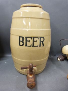 A quantity of treen to include three pairs of binoculars, Swift and Zenith, brass naval ships instrument, cream plastic telephone, Moira stoneware beer barrell and Myott Coronation mug