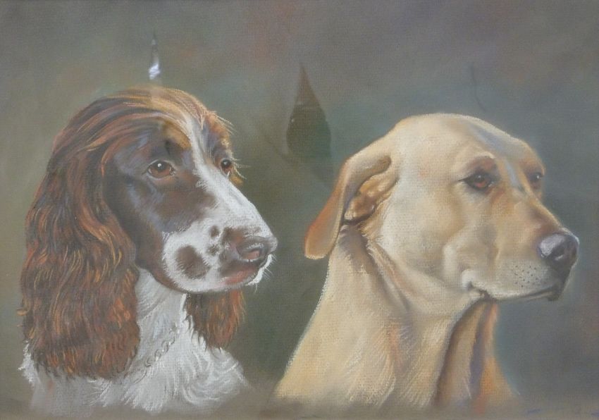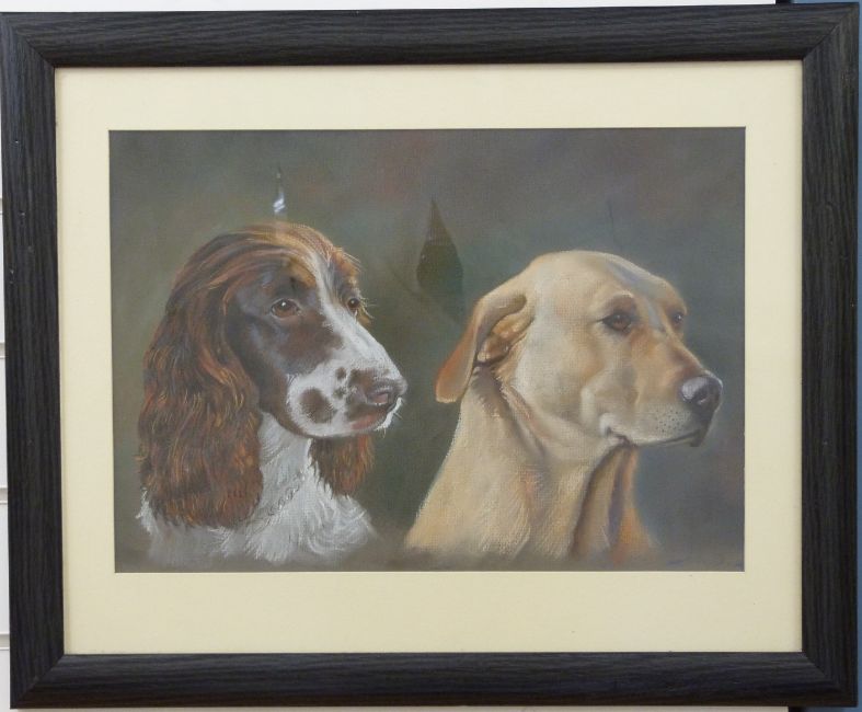 Andrew Quelch framed pastel of Springer Spaniel and Labrador dogs, monogrammed lower right, 29cm x 42cm.