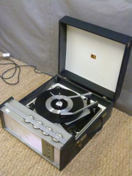 HMV c1960s portable electric record player with "Balfour Princess" four speed deck, in black Rexine finish case