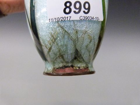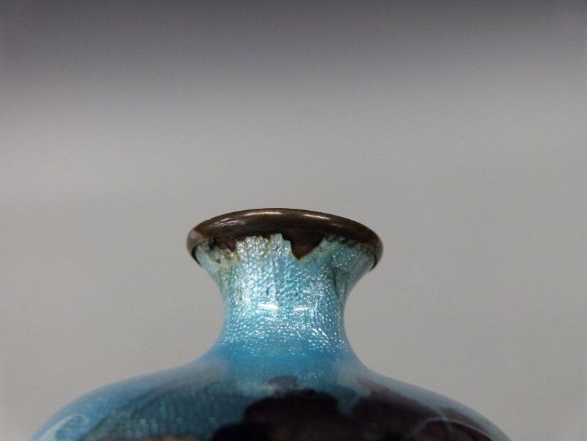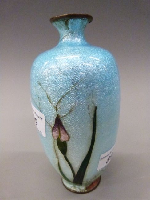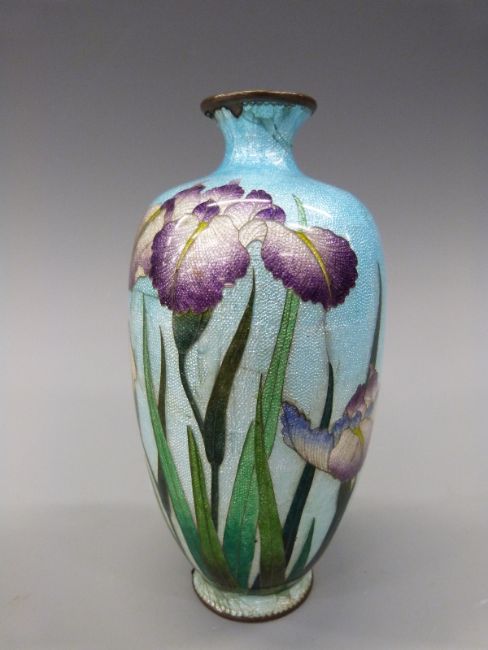 Japanese Ginbari enamel vase decorated with purple Iris on a graduated blue ground, 16cm tall