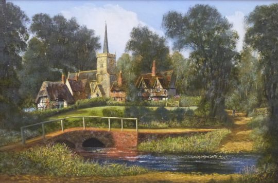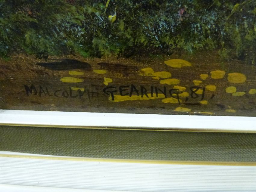 Malcolm Gearing modern oil on canvas village landscape, signed and dated 81 lower left, 59 x 90cm