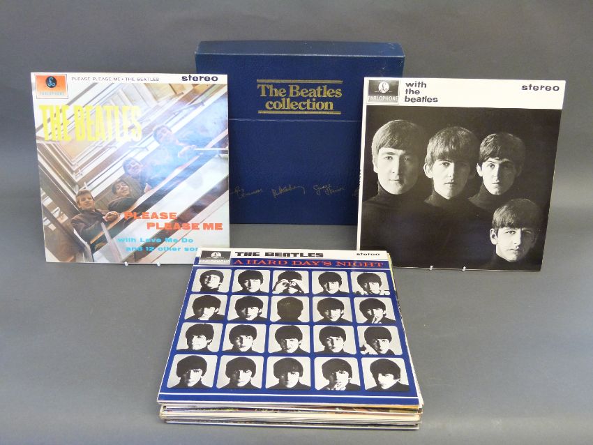 The Beatles collection blue box set comprising 15 LP's, condition of vinyl appears excellent, slight wear to box