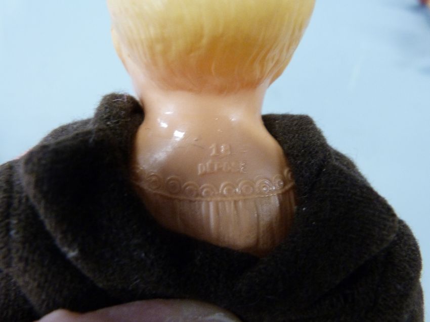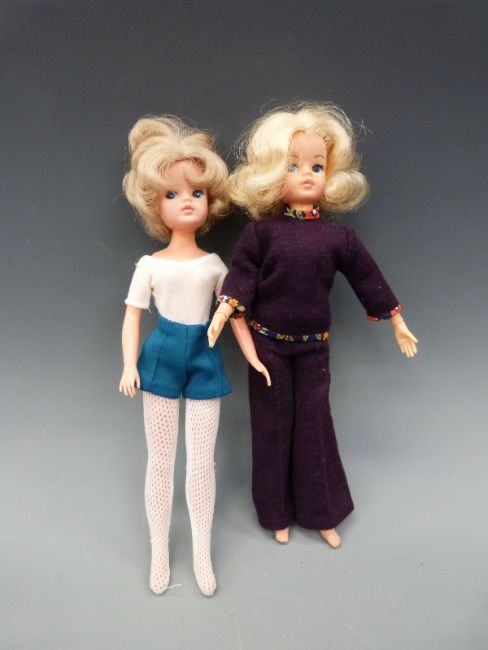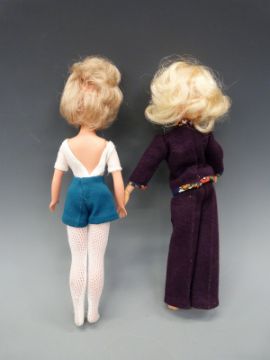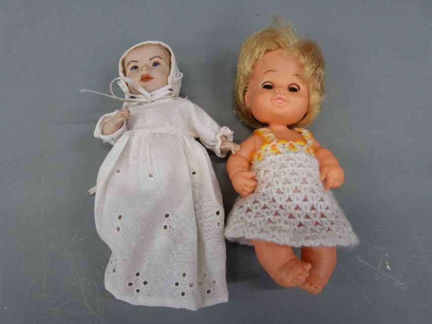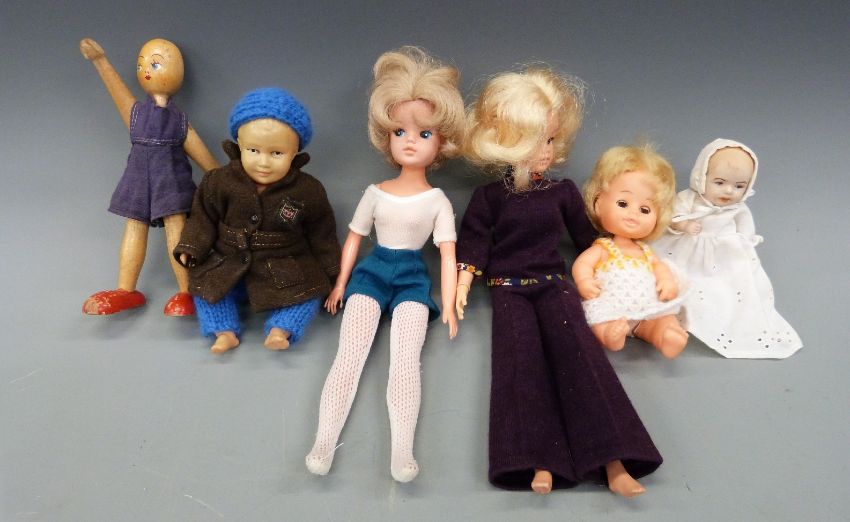 Six dolls, including two Sindy dolls, bisque jointed baby marked 'ABW', French celluloid boy doll marked '&Depose' Polish wood doll and another