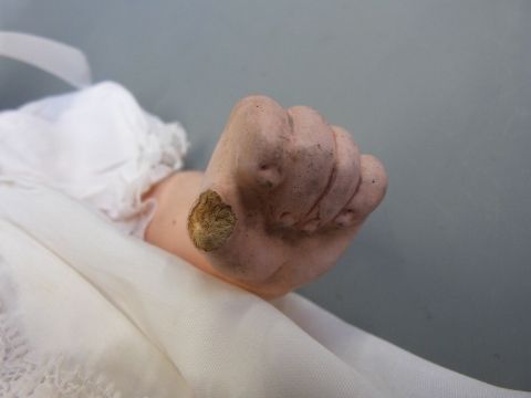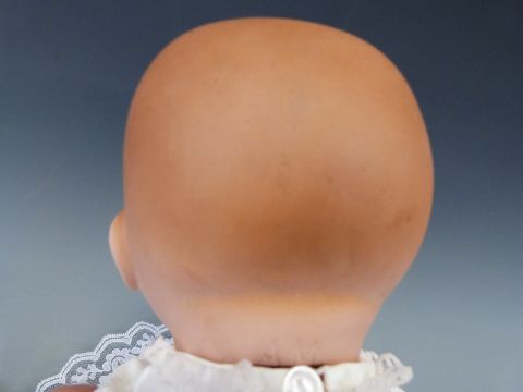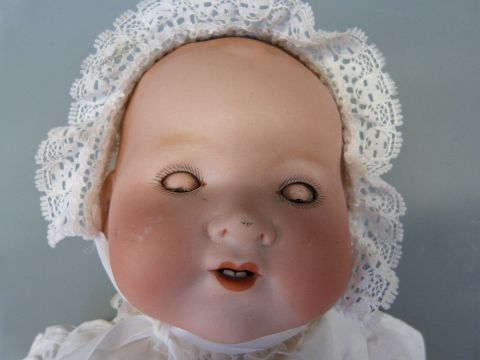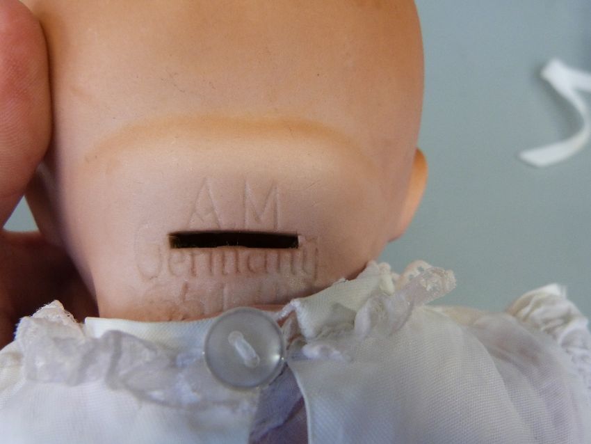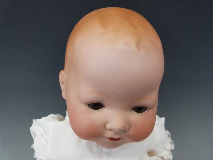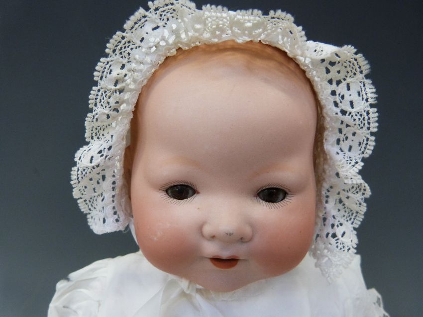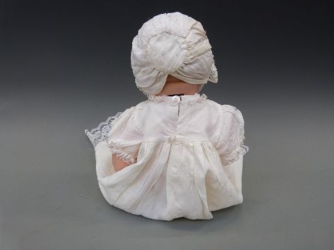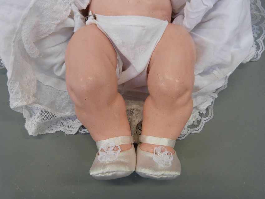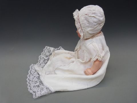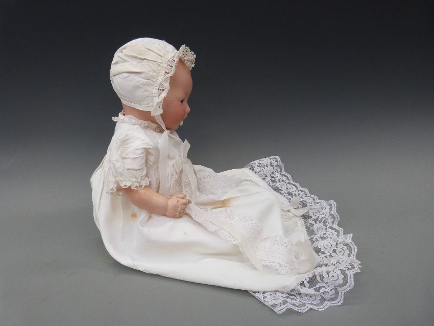 An Armand Marseille bisque headed baby doll with open mouth, weighted brown eyes and jointed composition body, in lace trimmed christening robe and wool jacket, marked 'AM Germany 351./4.K', approximately 40cm high
