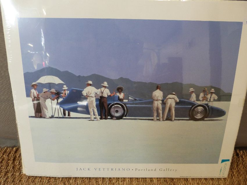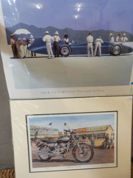 Roy Barrett "Chariot of the Sun" signed limited print 546/600 print of a Suzuki motorcycle, 24 x 37cm, and a Jack Vettriano print 'Bluebird at Bonneville'