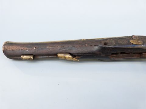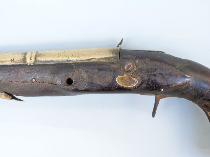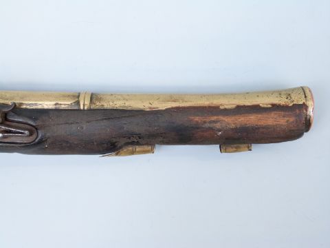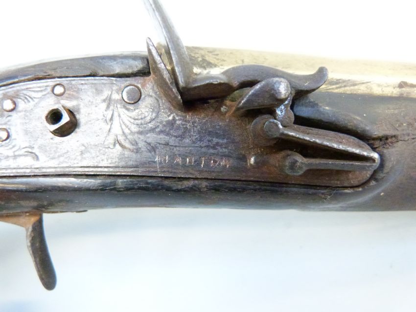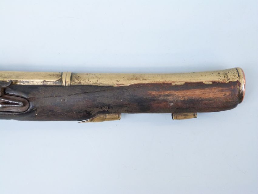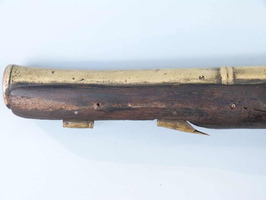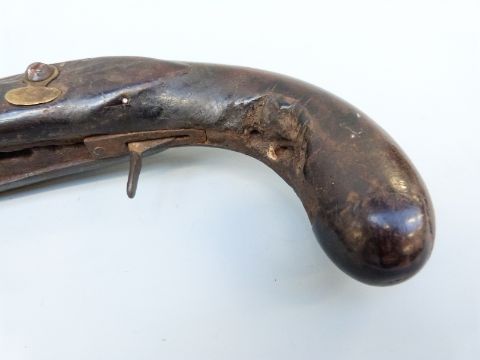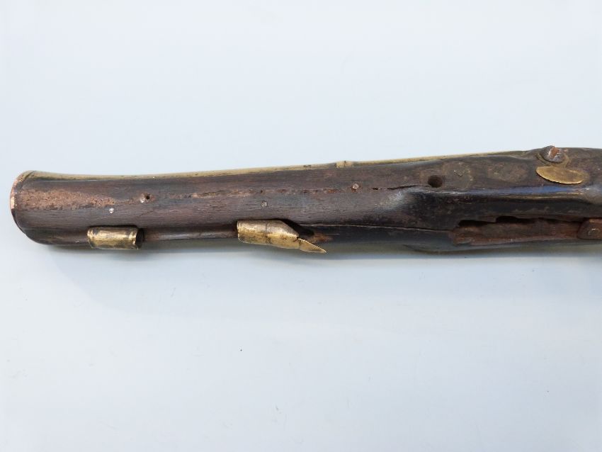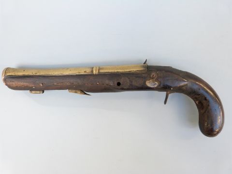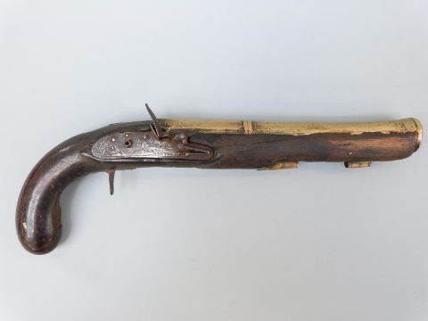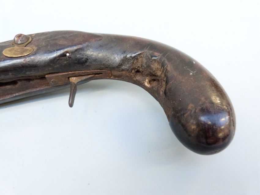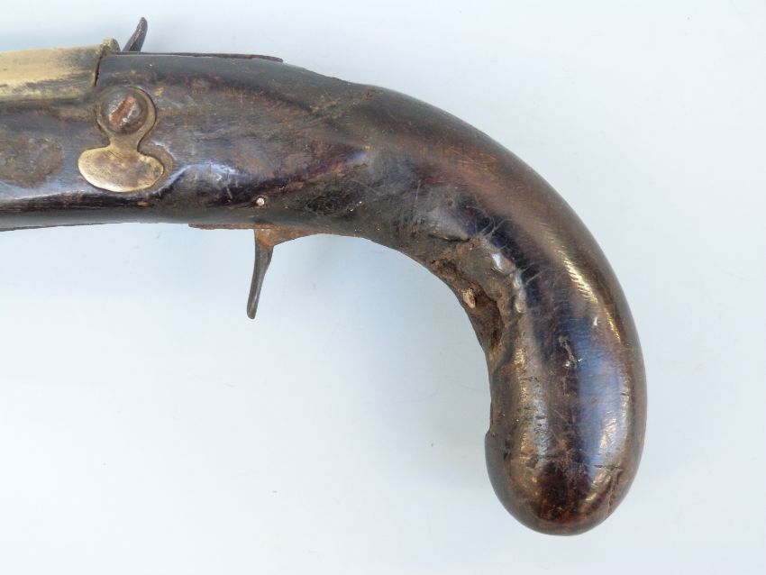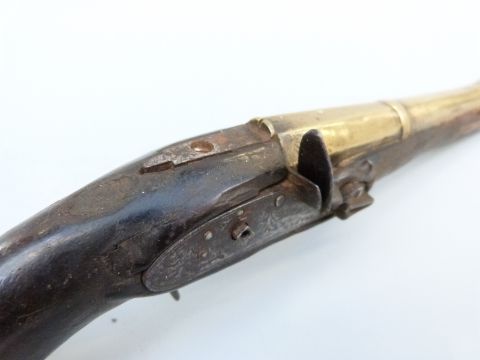 Joseph Manton flintlock hammer action blunderbuss pistol with named and engraved lock, brass mounts and 8.5 inch part octagonal flared brass barrel, overall length 34cm.