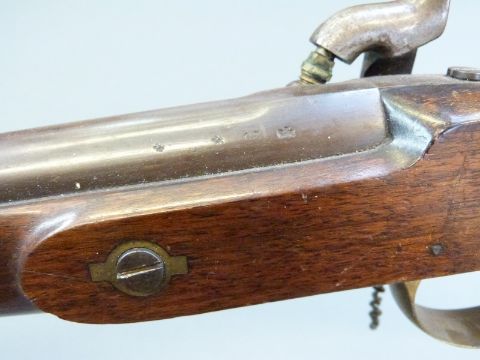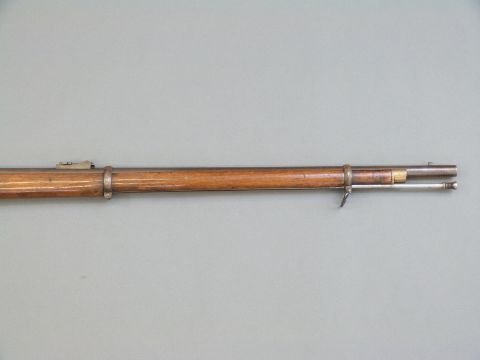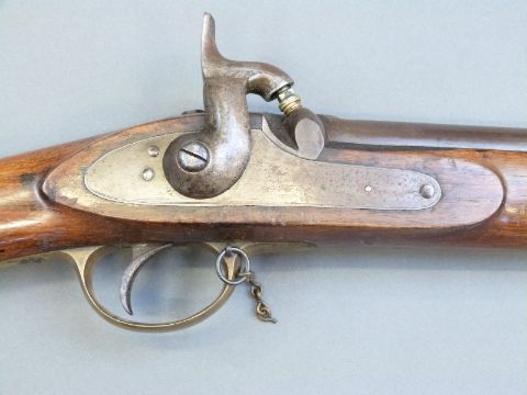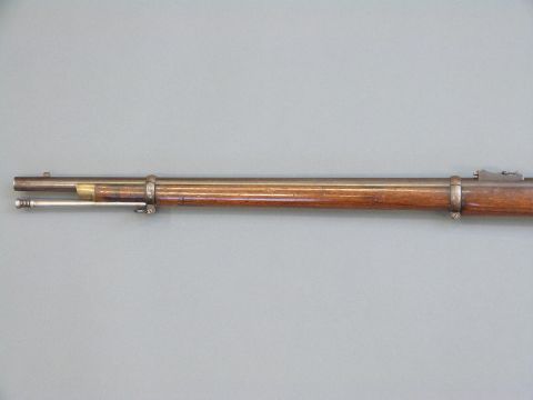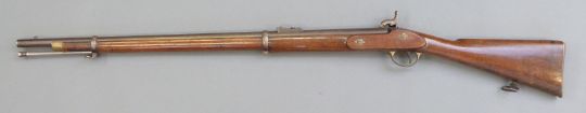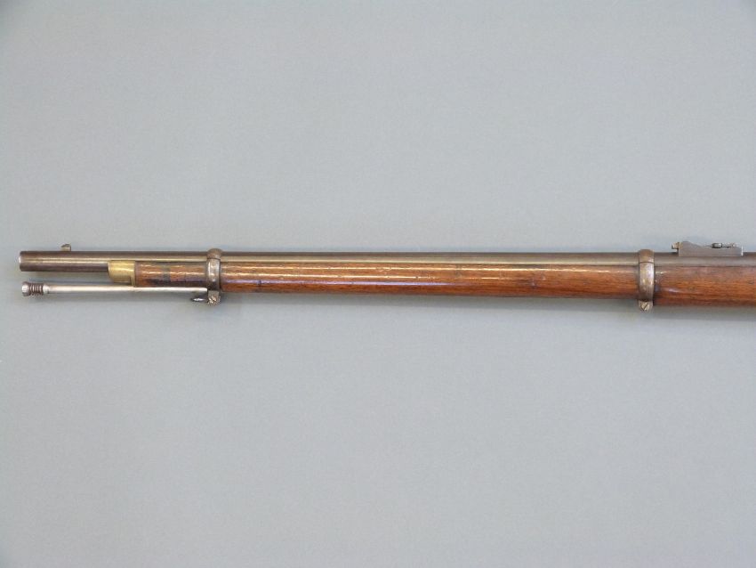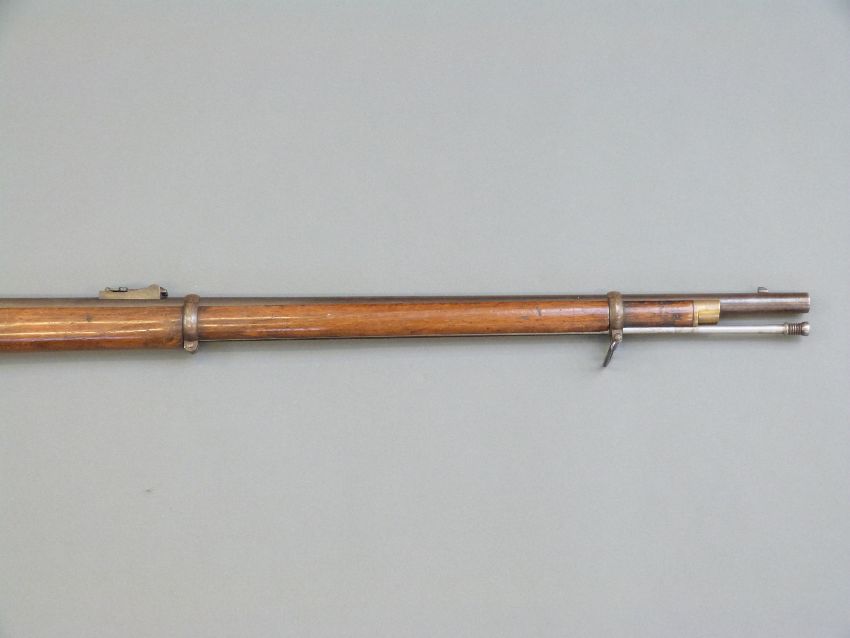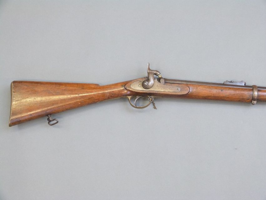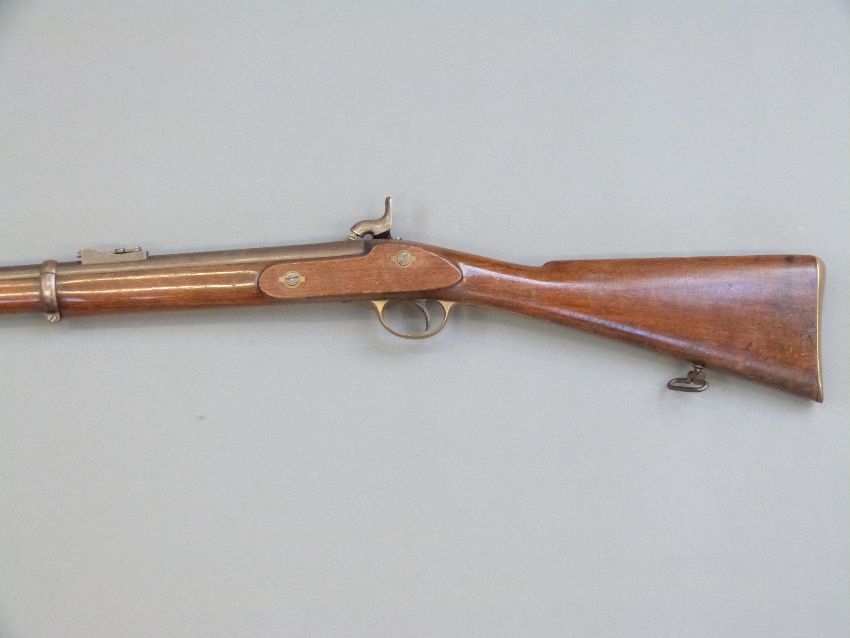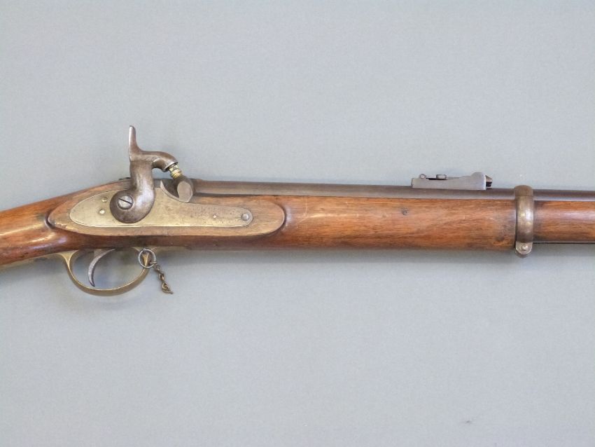 Enfield private purchase 2-band percussion hammer action rifle with indistinctly named lock, brass butt plate and trigger guard, suspension loops, steel ram-rod, adjustable sight and 33 inch barrel with three groove rifling, overall length 123.5cm.