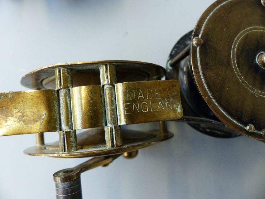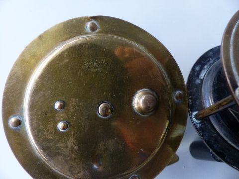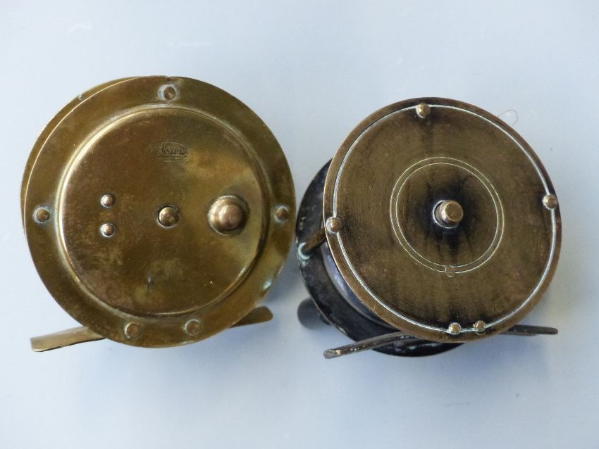 Two brass fishing reels, one marked 'The Milbro'