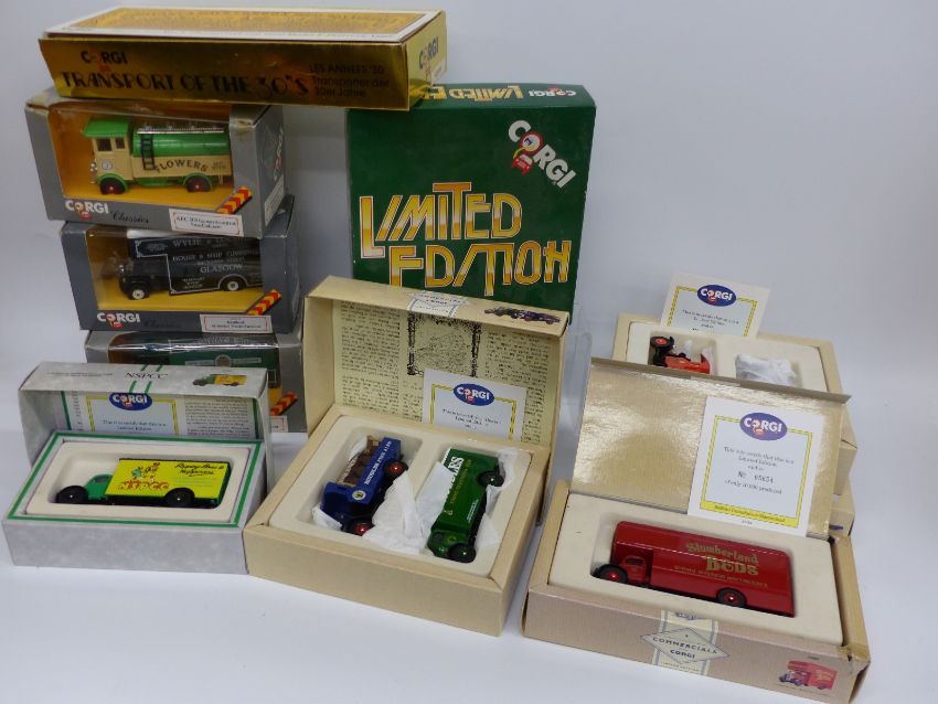 Nine Corgi Classics and Corgi Commercials diecast model vans and van sets including Flowers, Steinway & Sons, Wylie R Lochhead, Ruddles, Bass etc., some limited edition, all in original boxes.