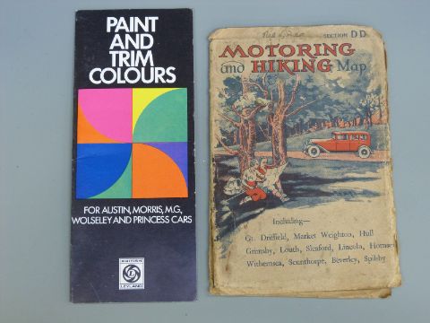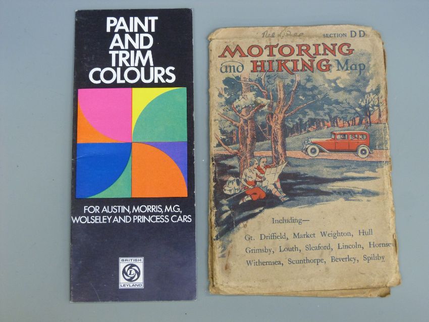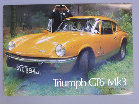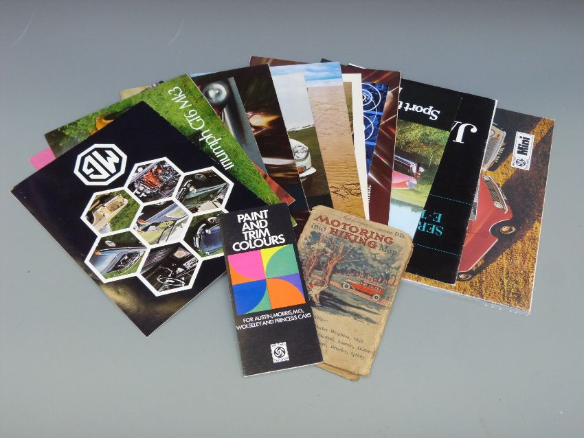 A collection of collectable car brochures including Jaguar E Type, Triumph TR6, MGB, Triumph Spitfire, Mini Cooper and Triumph GT6