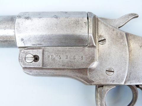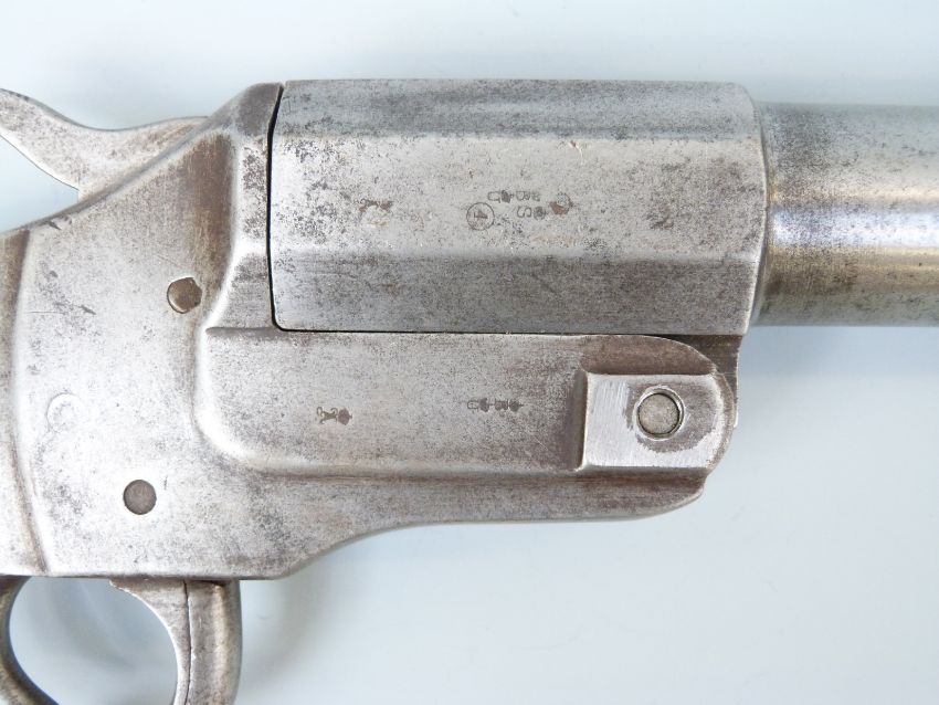 German WWI Hebel flare pistol with two part mahogany grip, push forward underlever, suspension loop and 9 inch part octagonal barrel stamped with multiple proof marks, overall length 39cm, serial number BP5361.