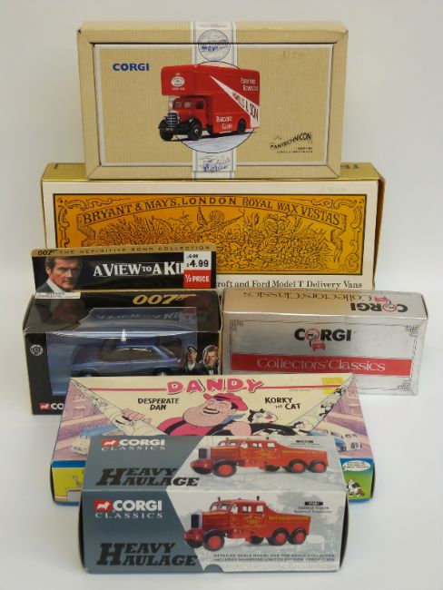 Seven Corgi and Corgi Classics diecast model vehicles and vehicle sets comprising Comic Classics Dandy van set, Alpine Rally set 97709, Transport of the 30s R2500, Commercials Pantechicon 97195, Collectors Classics C862, Heavy Haulage 17501, and James Bond A View to Kill Renault II CC06401, some limited edition, all in original boxes