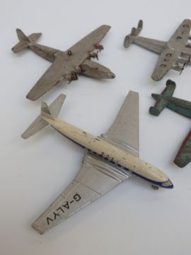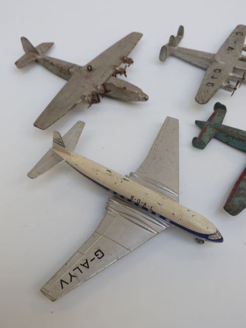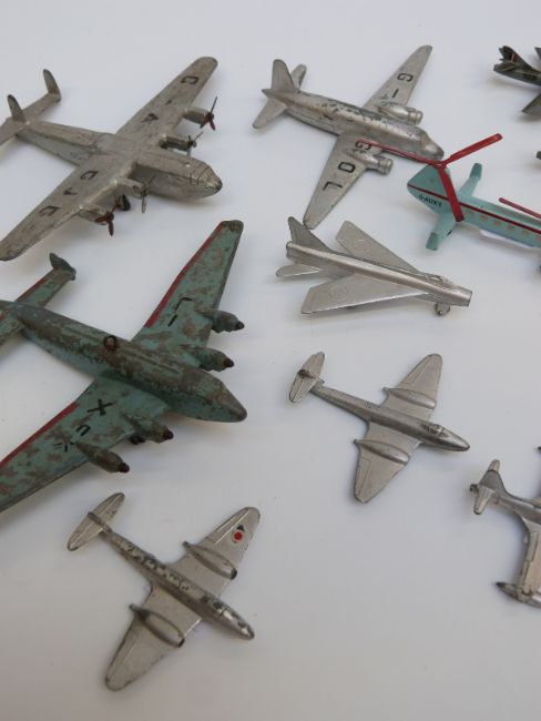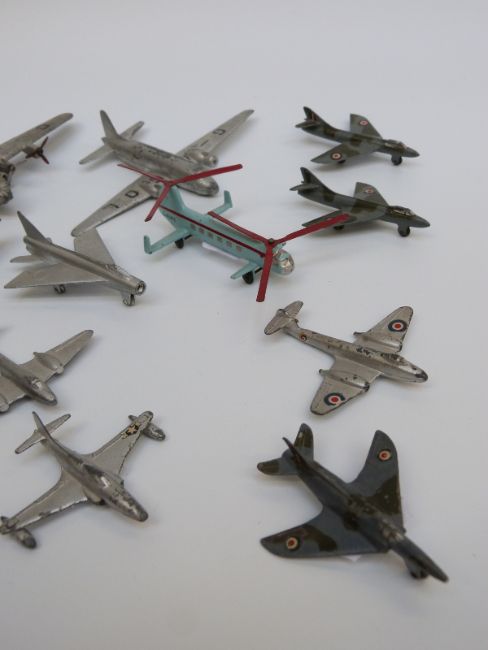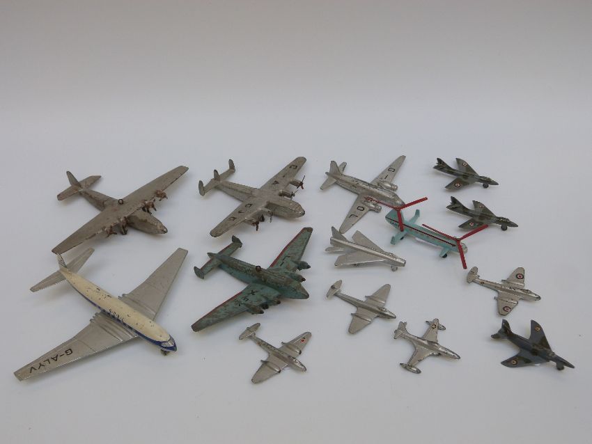 Fourteen Dinky Toys and Supertoys diecast model aircraft including Comet aeroplane, Hawker Hunter jets, Bristol helicopter etc, some with military markings