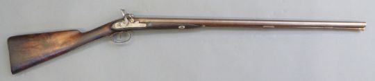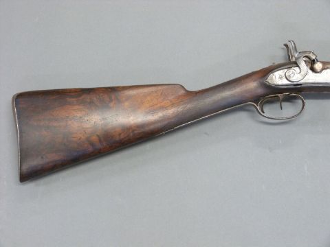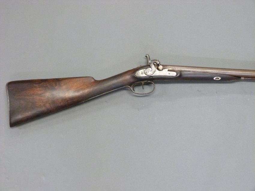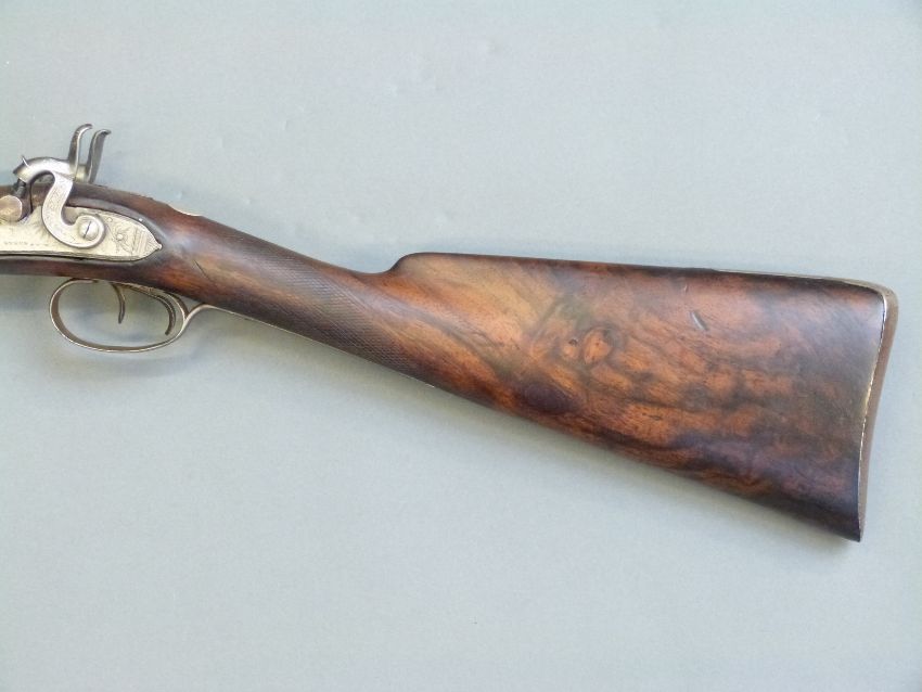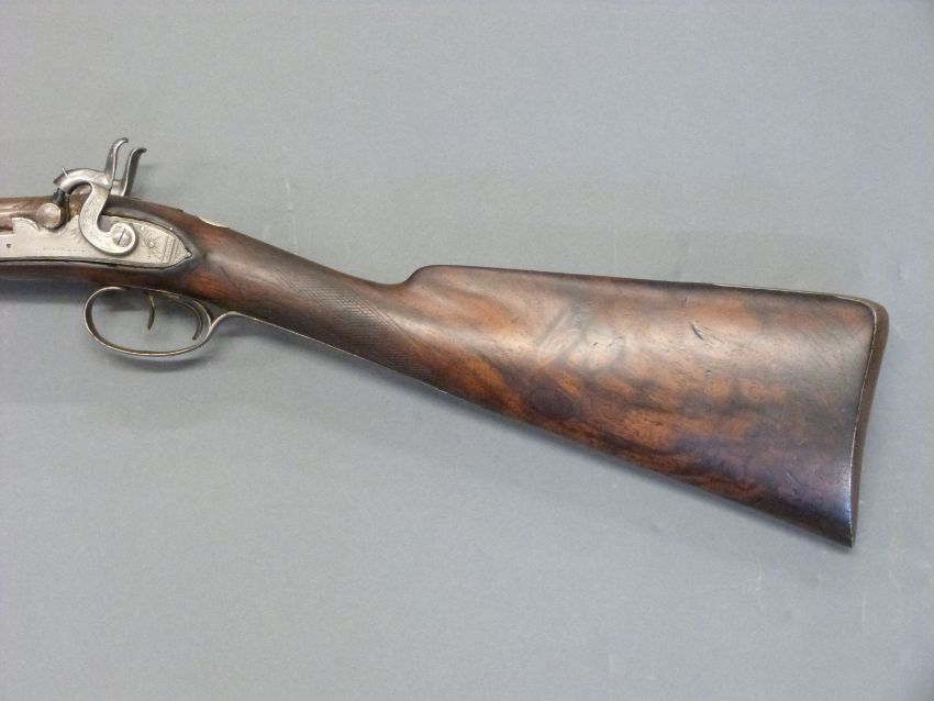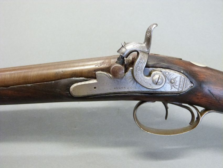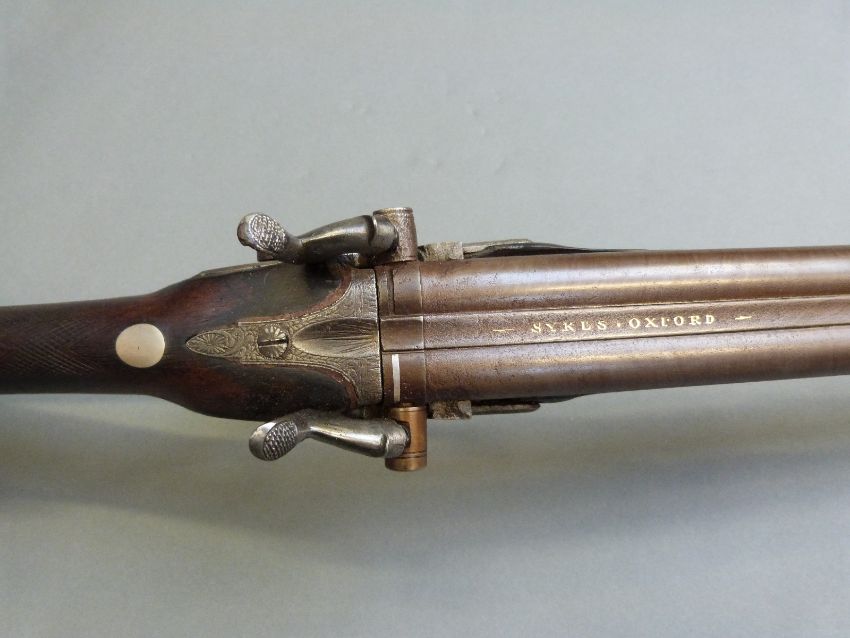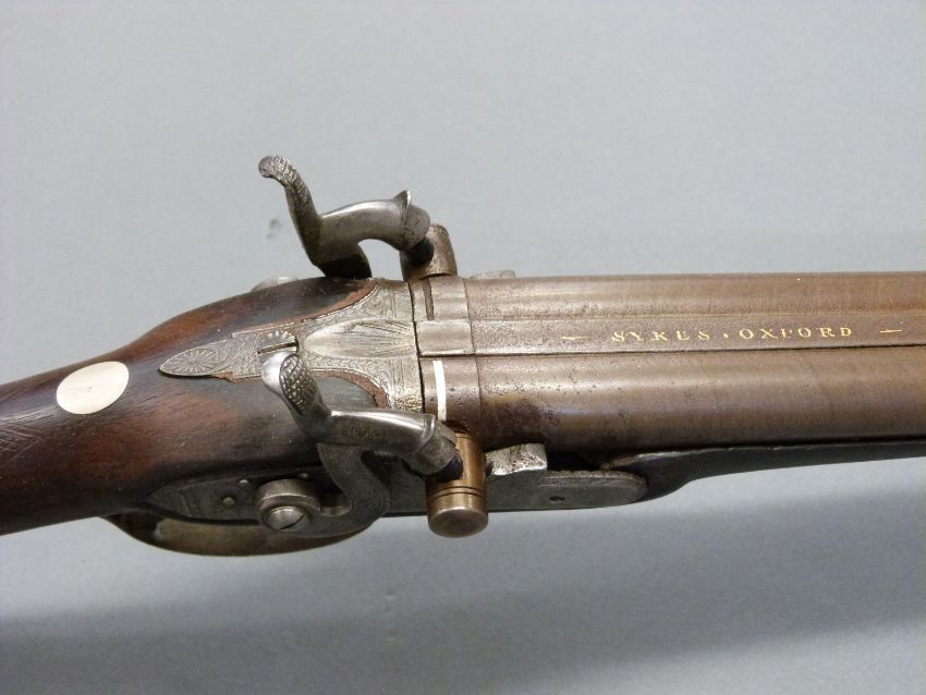 Sykes of Oxford 20 bore percussion converted from flintlock, side by side hammer action gun with named and engraved locks, engraved stylised dolphin hammers, engraved and pineapple finialled trigger guard, engraved steel butt plate and top plate, double trigger, chequered grip, walnut stock, vacant wrist cartouche and 29.5 inch named Damascus barrels inlaid with gold script and silver banding, overall length 114cm.
