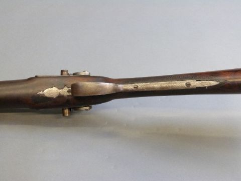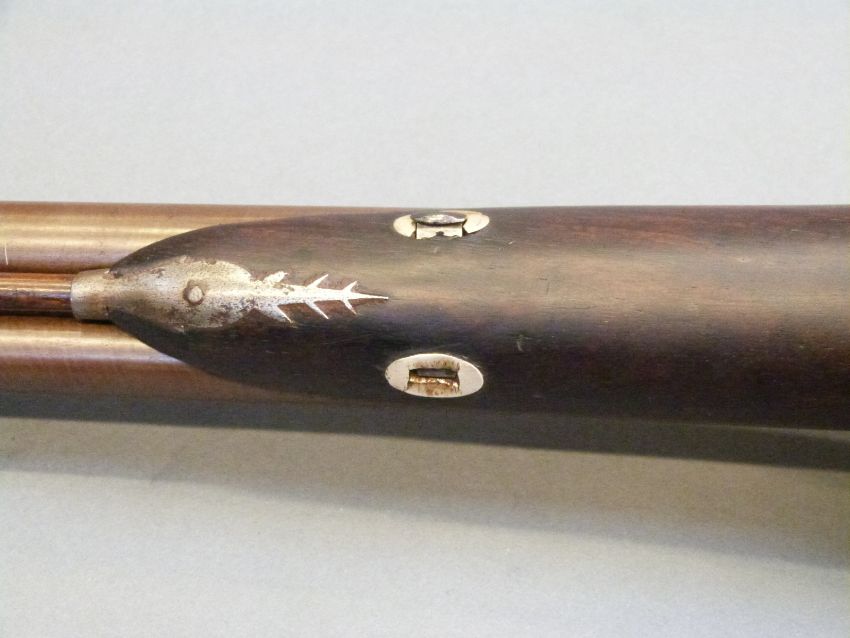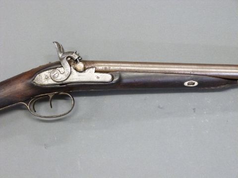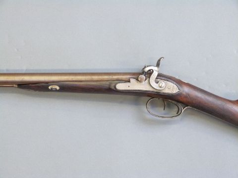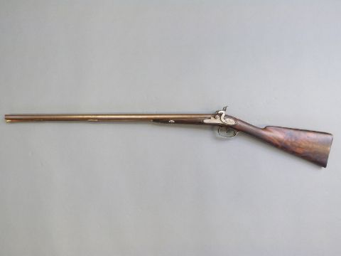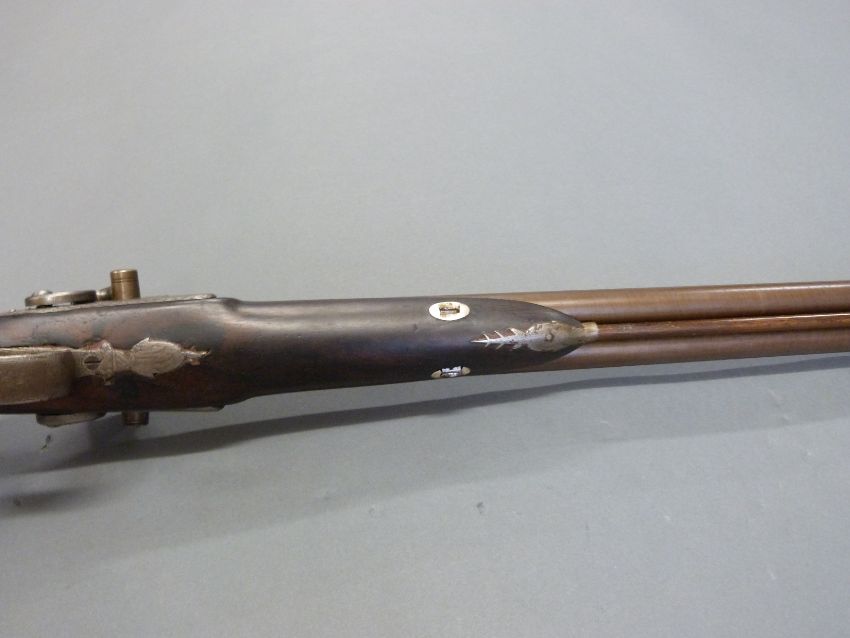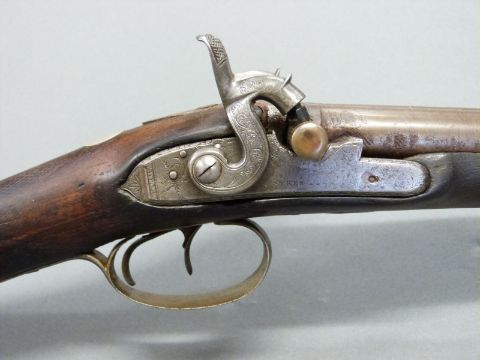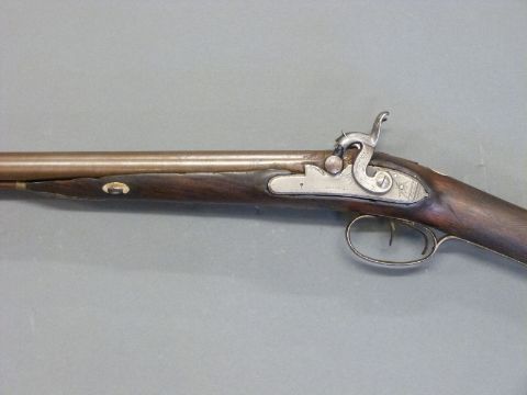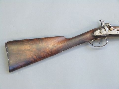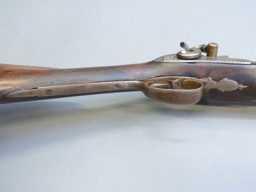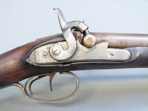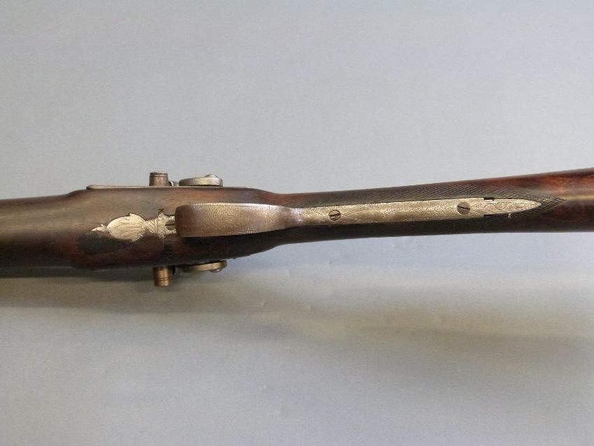 Sykes of Oxford 20 bore percussion converted from flintlock, side by side hammer action gun with named and engraved locks, engraved stylised dolphin hammers, engraved and pineapple finialled trigger guard, engraved steel butt plate and top plate, double trigger, chequered grip, walnut stock, vacant wrist cartouche and 29.5 inch named Damascus barrels inlaid with gold script and silver banding, overall length 114cm.