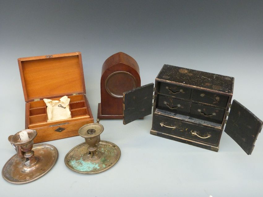 A pair of plated chamber sticks, Japanese lacquer box, wooden box and a clock