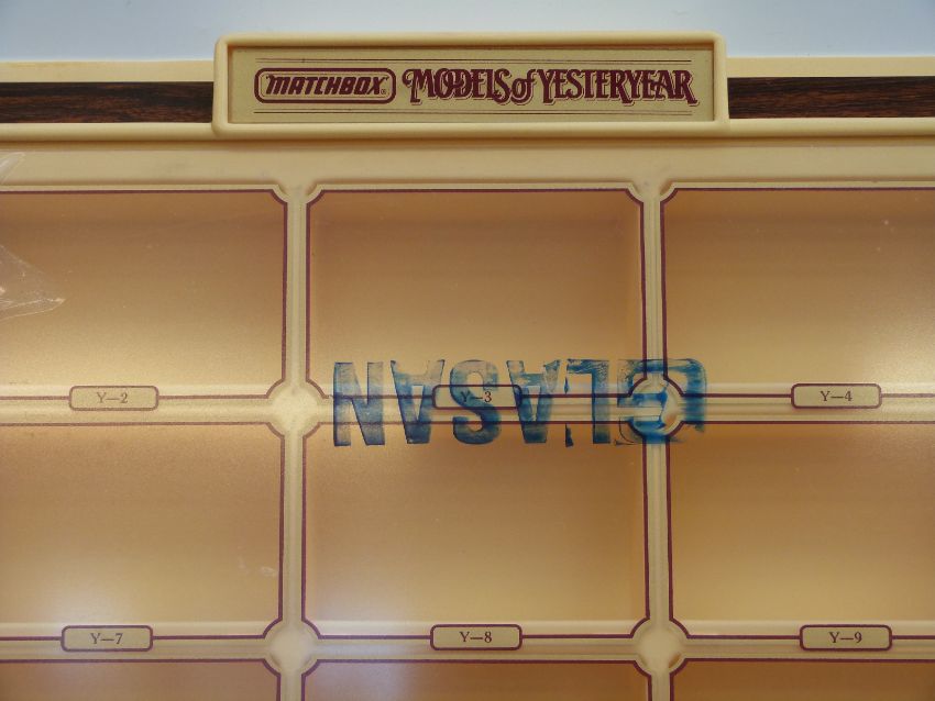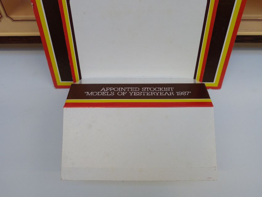 Matchbox Models of Yesteryear model vehicle display case (75x82cm) together with two card shop display stands, largest 42x30cm.