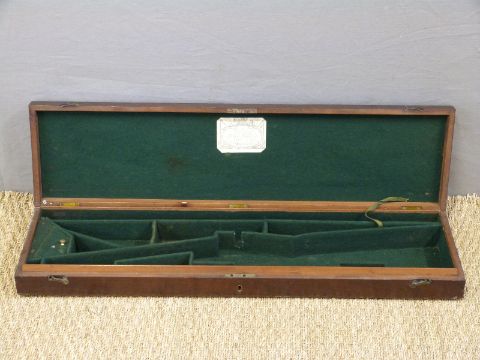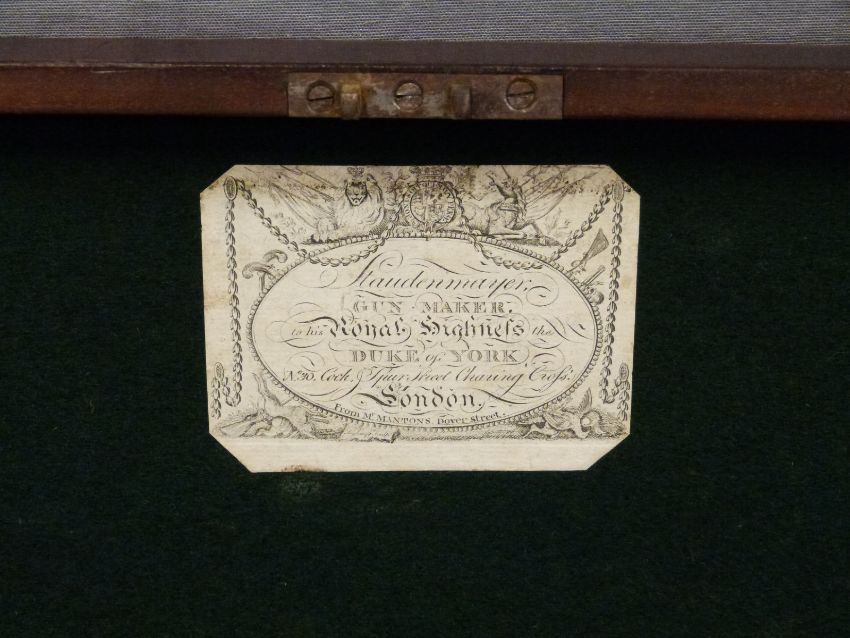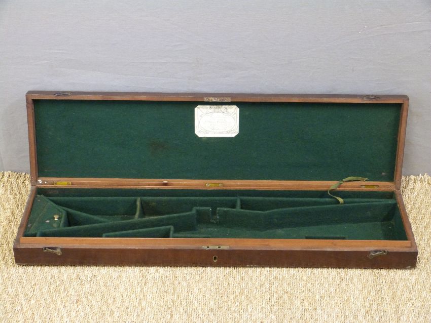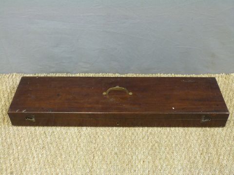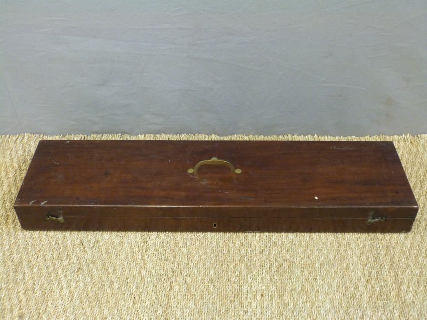Samuel Staudenmayer mahogany muzzle loading gun case with brass lock and folding carry handle, baize lined fitted interior and original maker's label, 32x8.25 inches