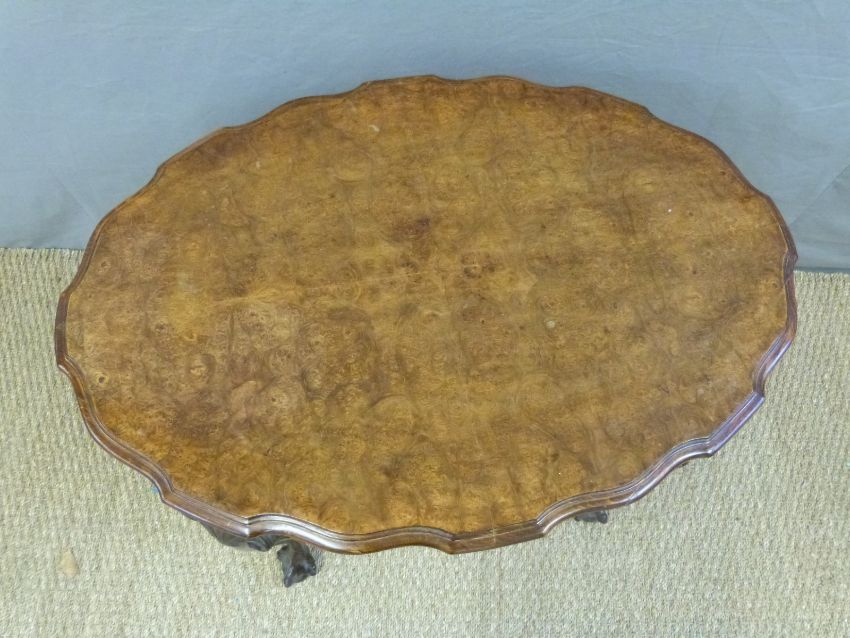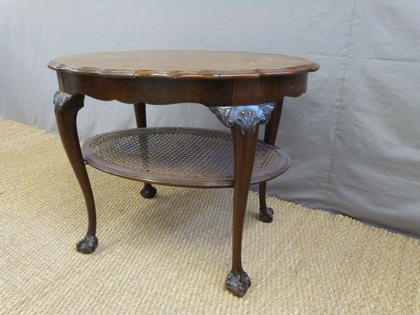 A 19thC quarter veneered oval walnut table with bergere undershelf (H65 x L85cm)