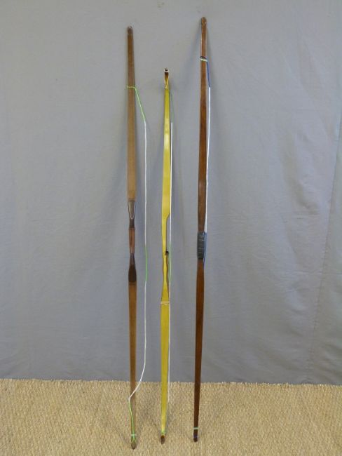Three wooden archery bows one with layered decoration.