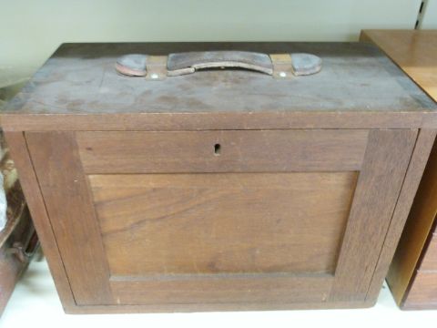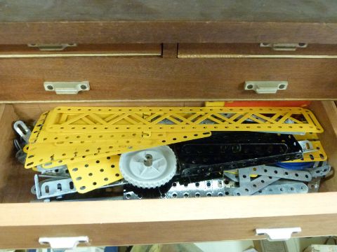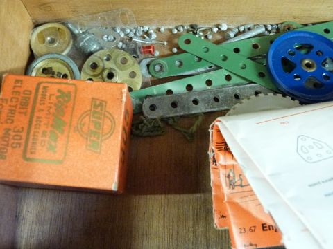 A collection of loose Meccano parts with instructions for outfits 1, 2/3 and 4/5/6, in a vintage mahogany tool chest.