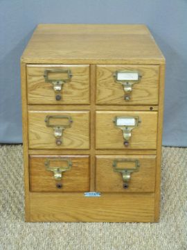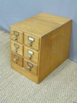 An oak desktop cabinet of six drawers of shopfitting/haberdashery interest (H40 x W33 x D45cm)
