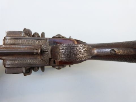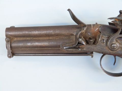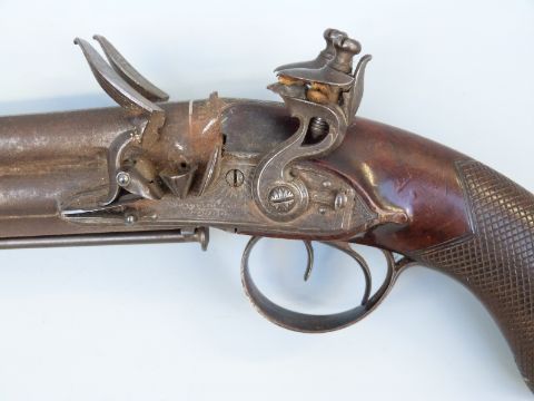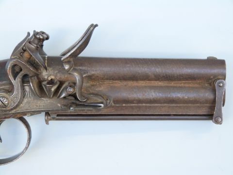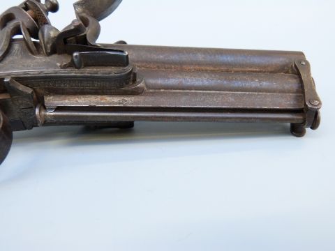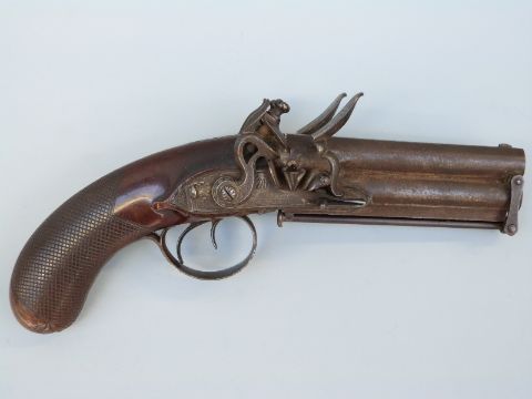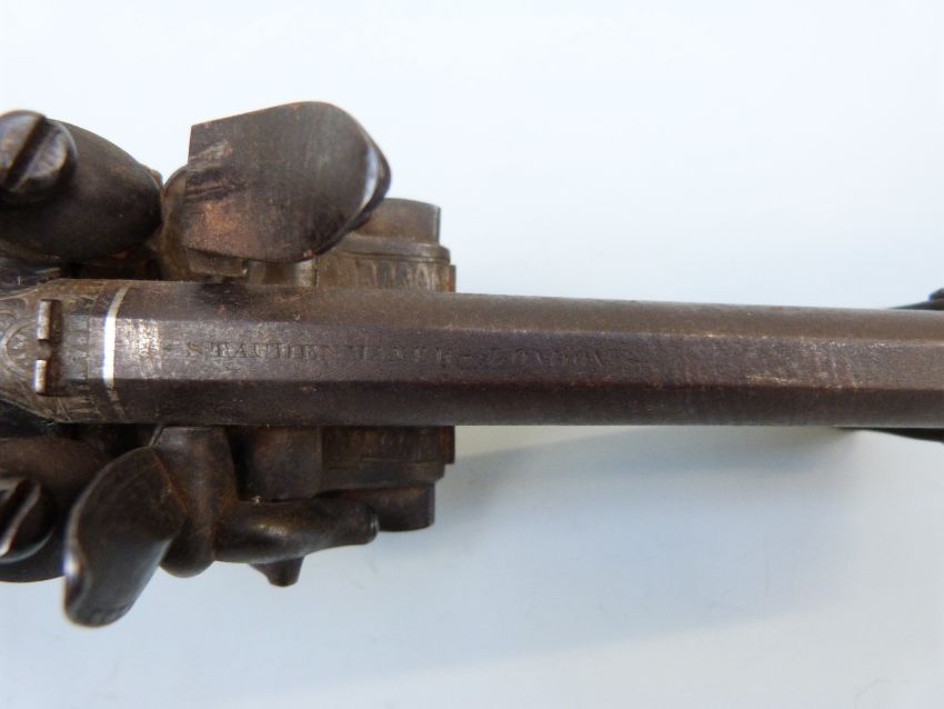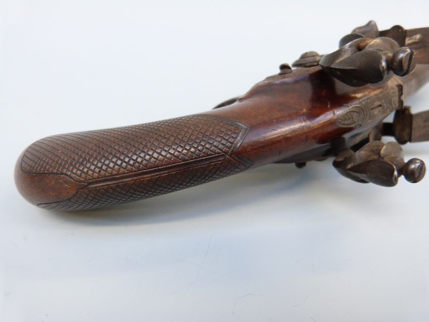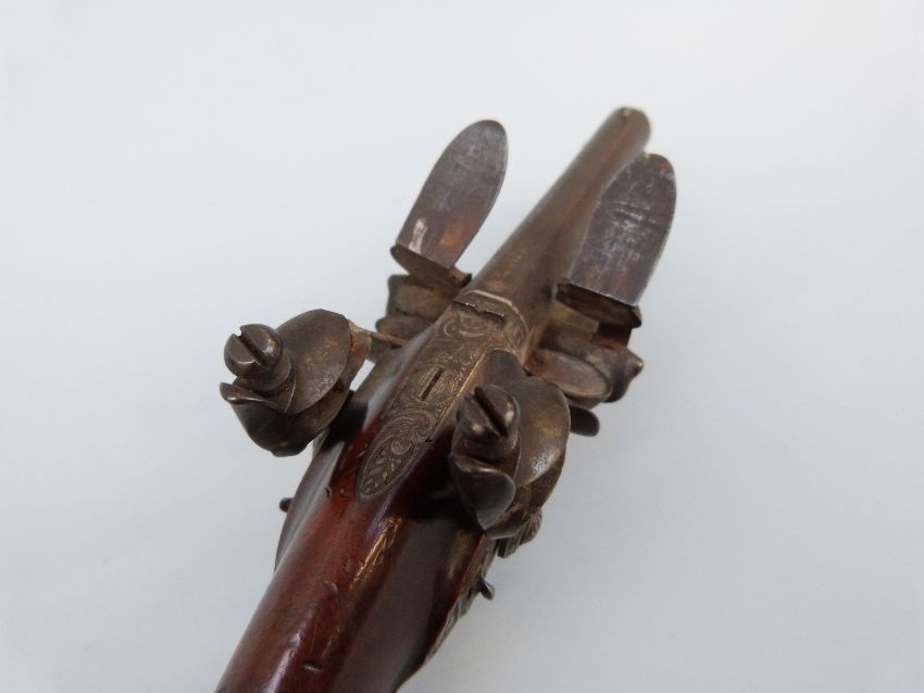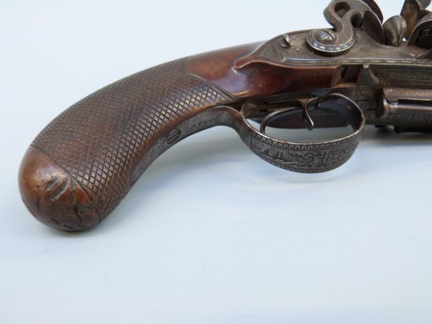 Samuel Staudenmayer of London double barrelled over and under flintlock hammer action pistol with named and engraved locks, chequered grip, engraved trigger guard, hammers, top plate and underside, captive ram-rod and four inch silver inlaid Damascus barrels, overall length 23.5cm.