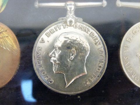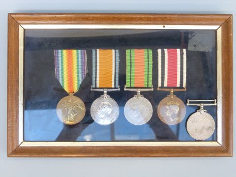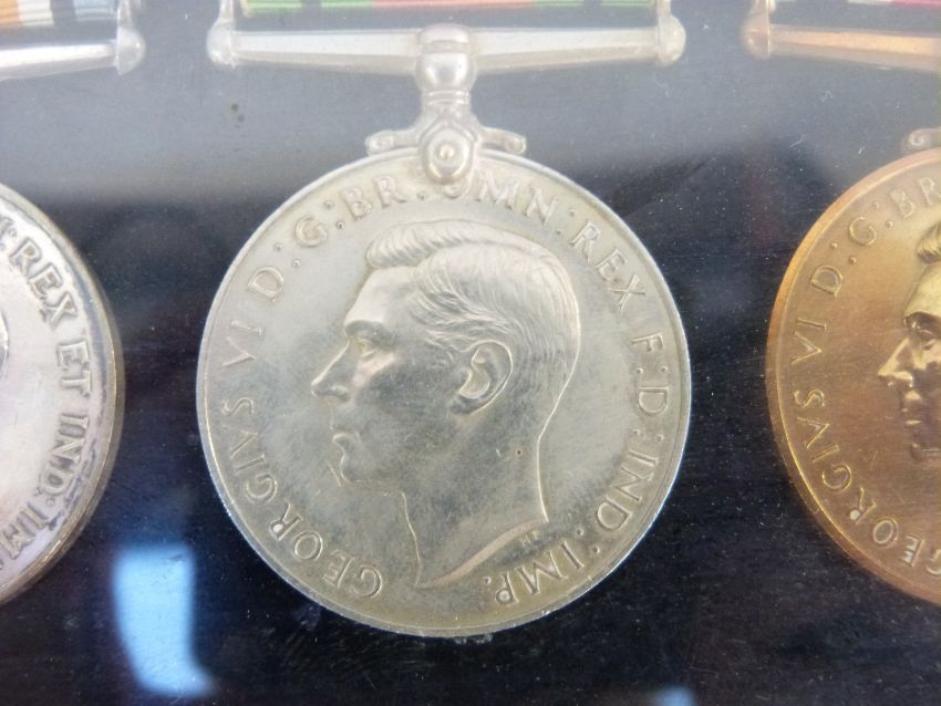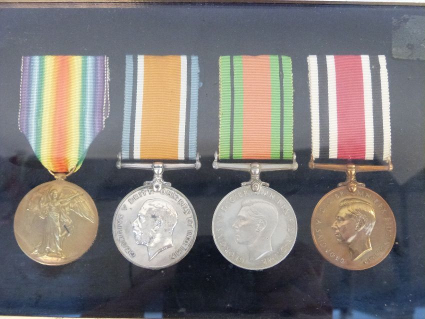 A set of four mounted medals comprising WWI Victory medal named to 287436 H Barton Army Service Corps, WWI war medal and WWII Defence Medal together with a Special Constable Medal for H.Barton a separate WWII war medal