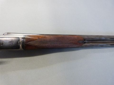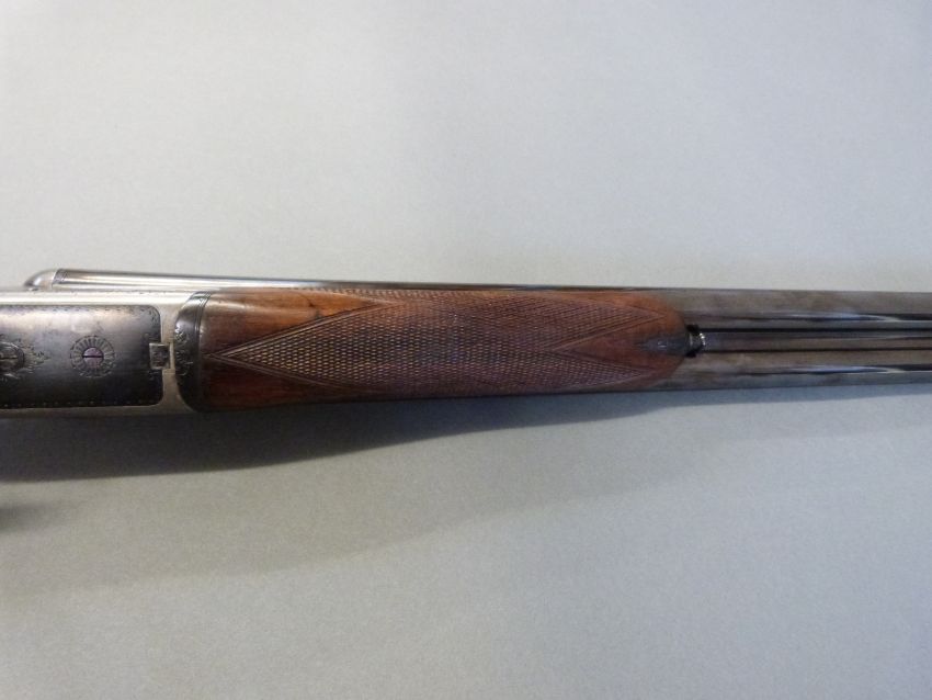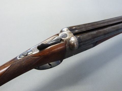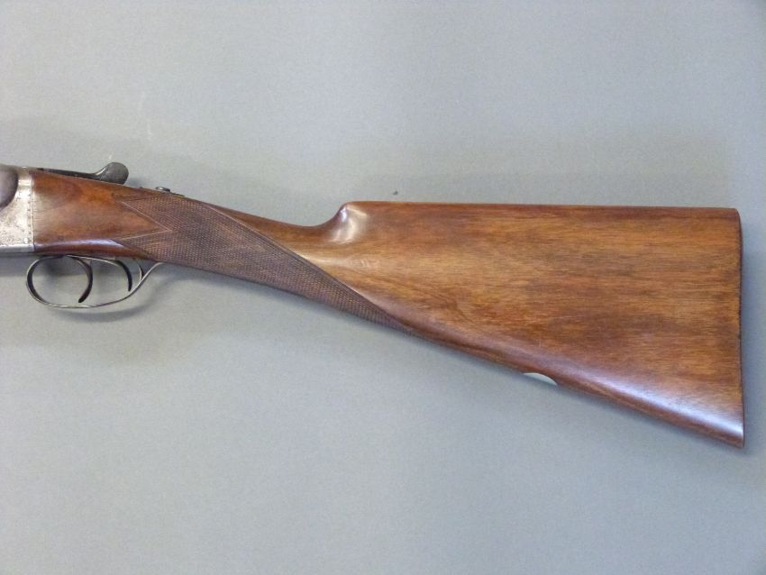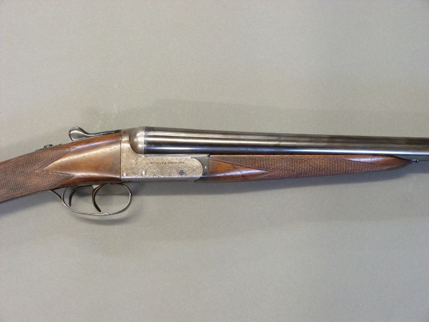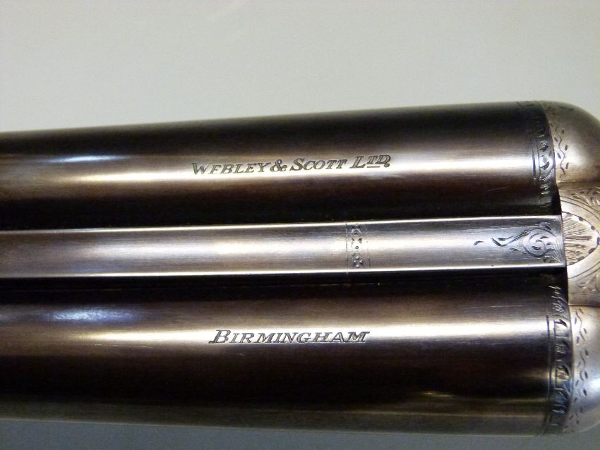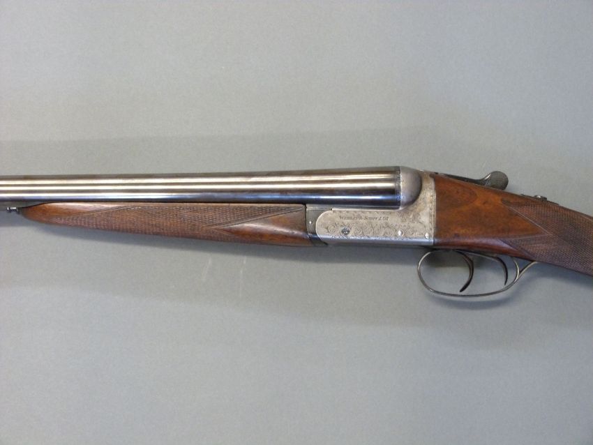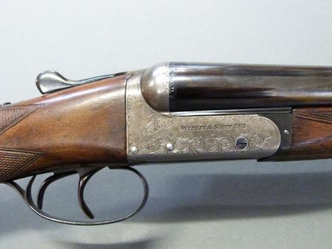 Webley and Scott 12 bore side by side ejector shotgun with named and engraved locks, chequered grip and forend, double trigger, engraved trigger guard, top plate, top lever and underside, vacant cartouche to the underside of the stock and named 28 inch barrels 1/2 and unchoked barrels engraved 'Webley & Scott Birmingham', overall length 113cm, length of pull 37cm, serial number 123424. PLEASE NOTE THAT A VALID RELEVANT FIREARMS/SHOTGUN CERTIFICATE IS REQUIRED TO HANDLE/PURCHASE THIS ITEM.