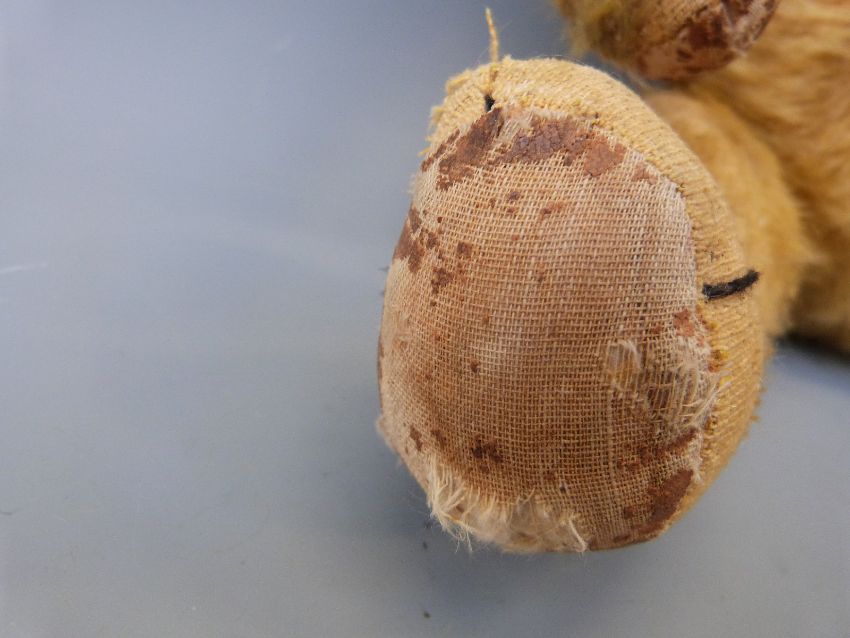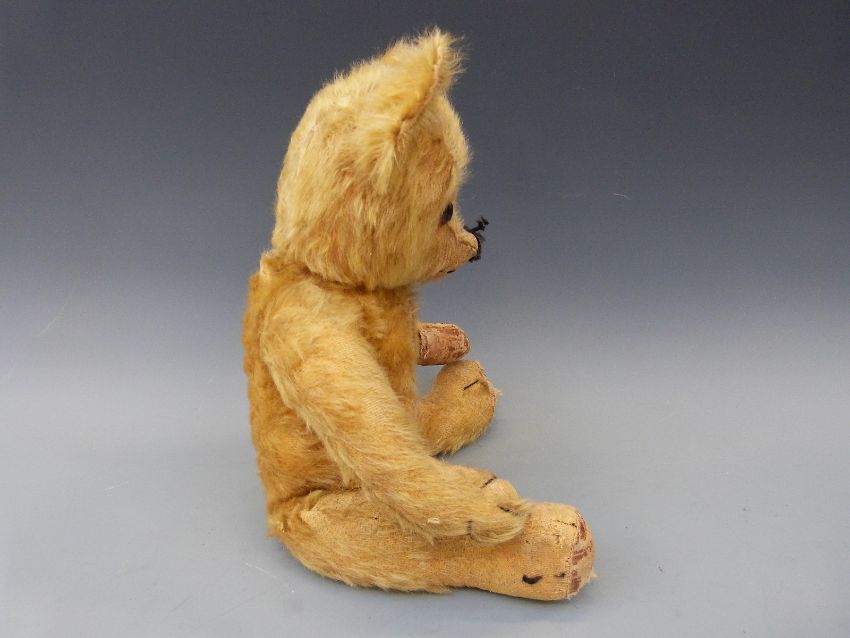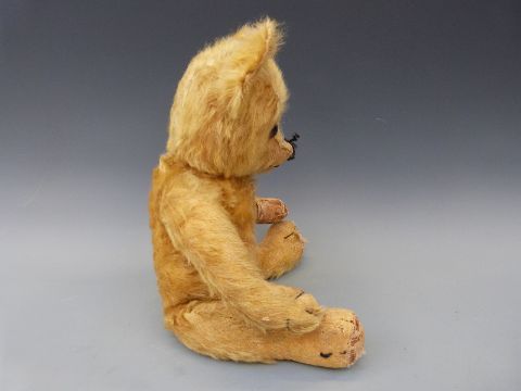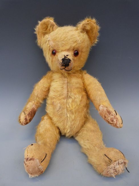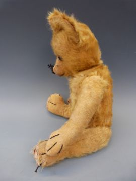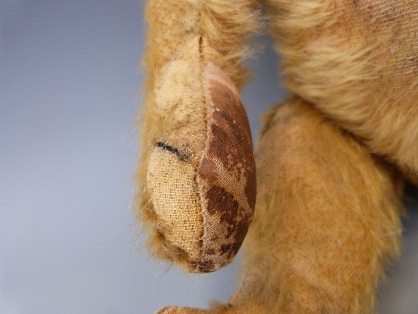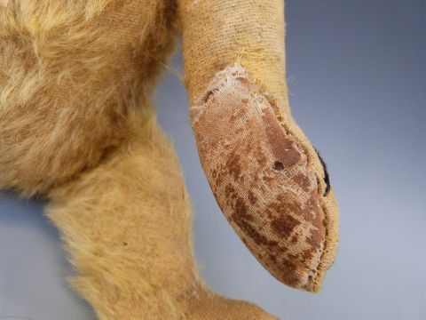 A vintage teddy bear c1920's with golden mohair, glass eyes, swivel joints, the cocked wrists and 90° feet with kid leather pads