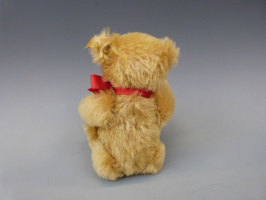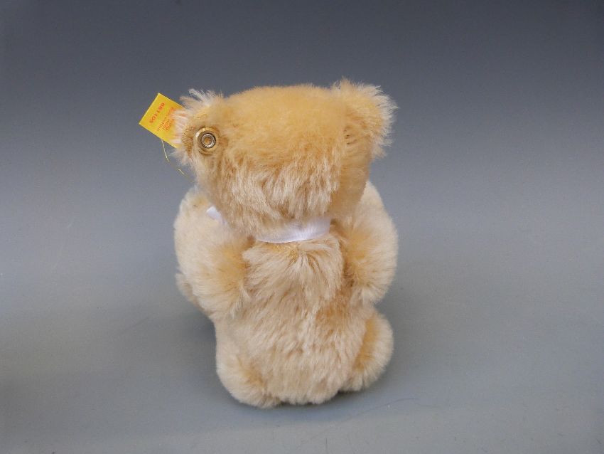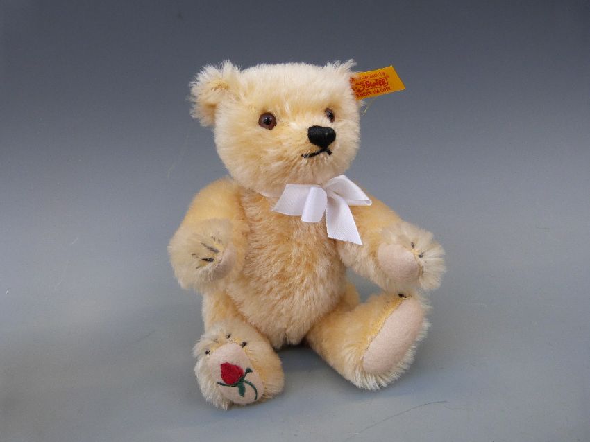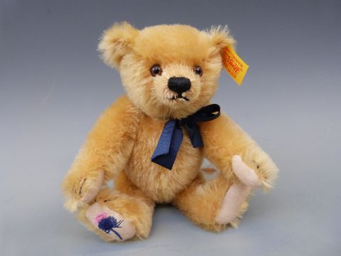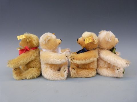 Four Steiff Teddy bears all with golden/blonde mohair, shaved snouts, jointed limbs and national flowers representing England, Scotland, Wales and Ireland embroidered to pads, all 20cm tall.