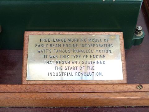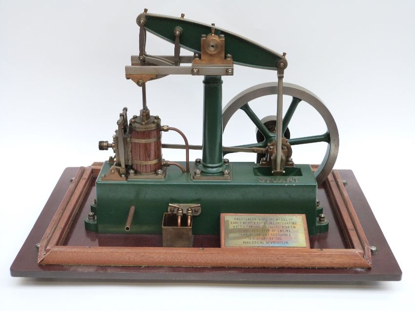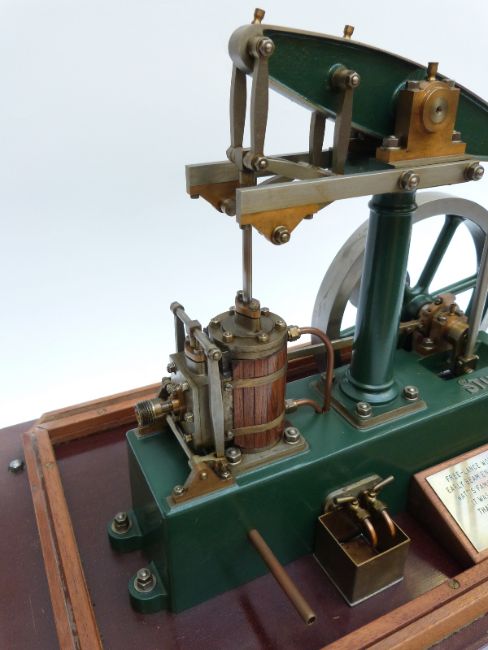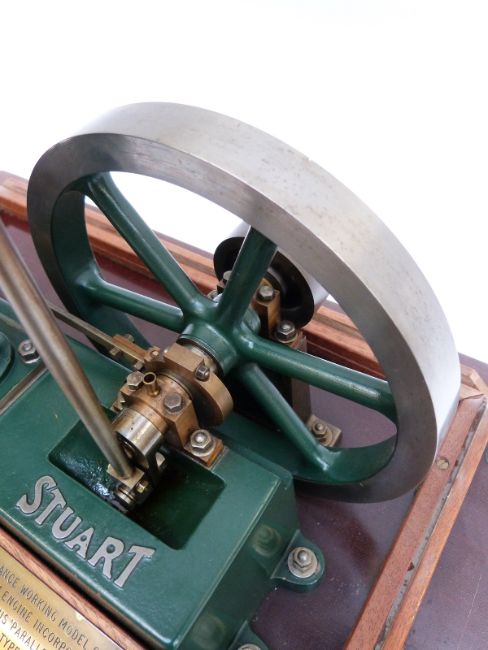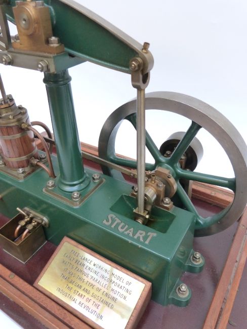 Stuart live steam model beam engine with Watts Parallel Motion, 1in bore, 2in stroke, 7in spoked flywheel and drain cocks, on wooden plinth with brass display plaque, length of engine 34cm