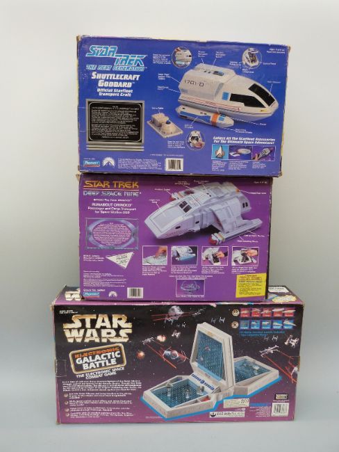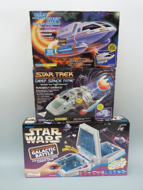 Two Playmates Star Trek collectors edition toys Deep Space Nine Runabout Orinoco and The Next Generation Shuttlecraft Goddard together with a Tiger Star Wars Electronic Galactic Battle, all in original boxes.