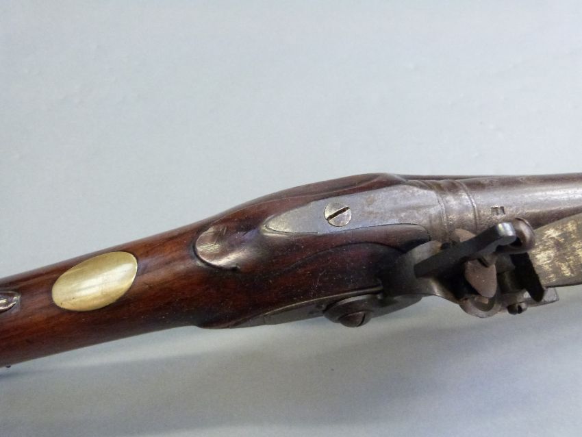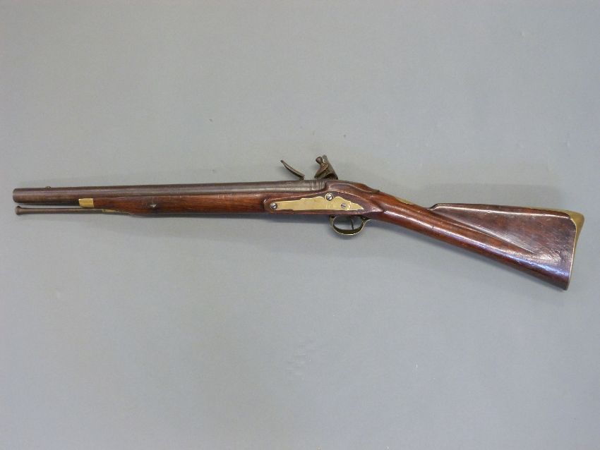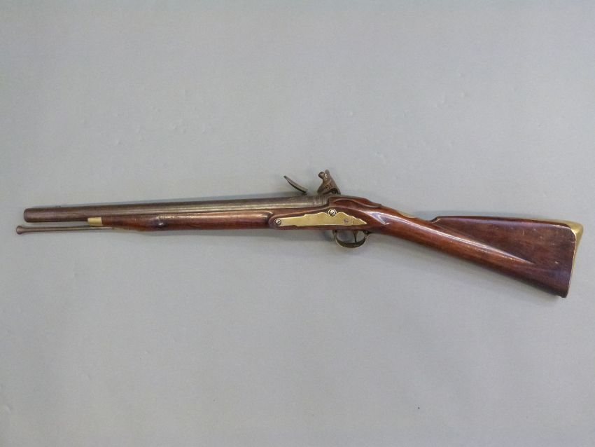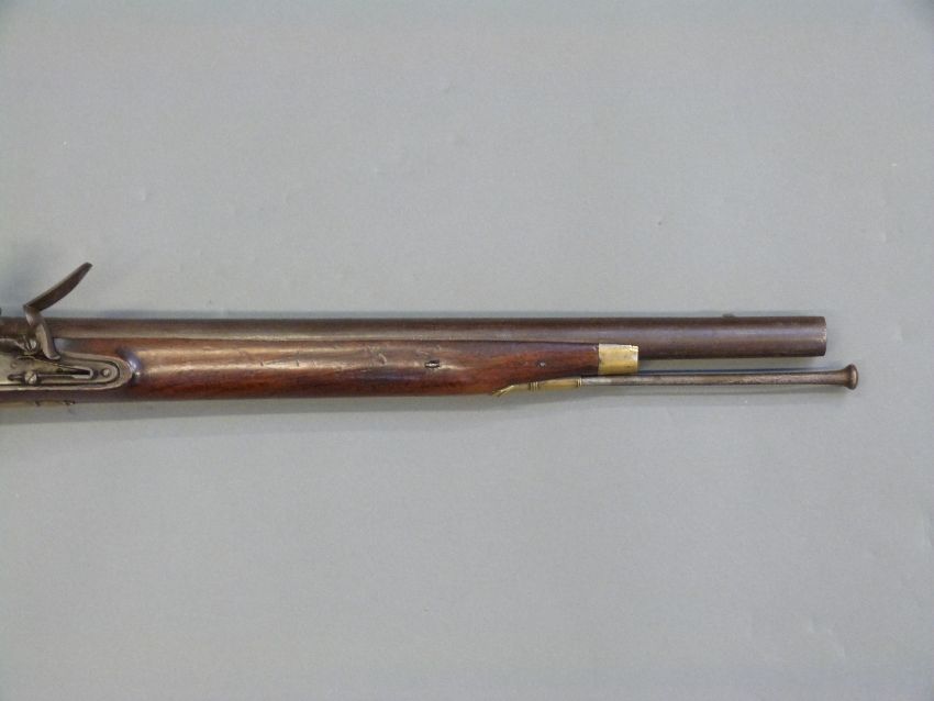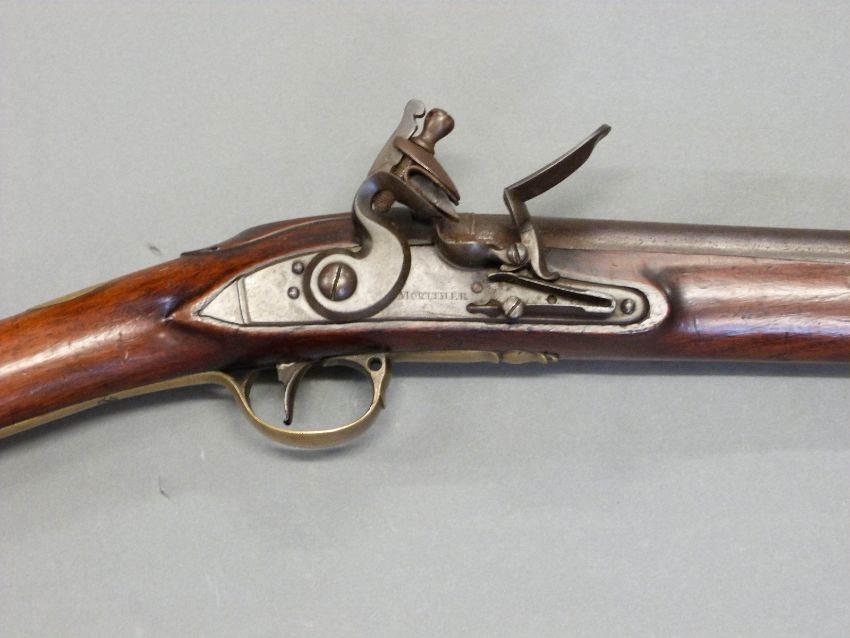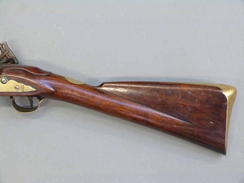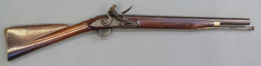 Harvey Walklate Mortimer of London 12 bore flintlock hammer action coaching gun with named lock, brass trigger guard, butt plate, mounts and vacant wrist cartouche, shaped stock, steel ramrod and 19 inch named smooth bored steel barrel, overall length 87cm.