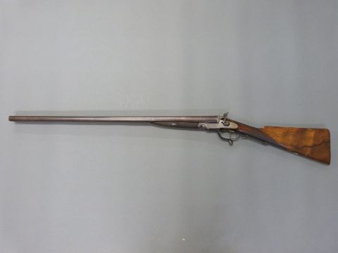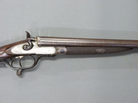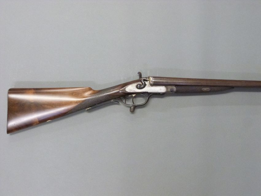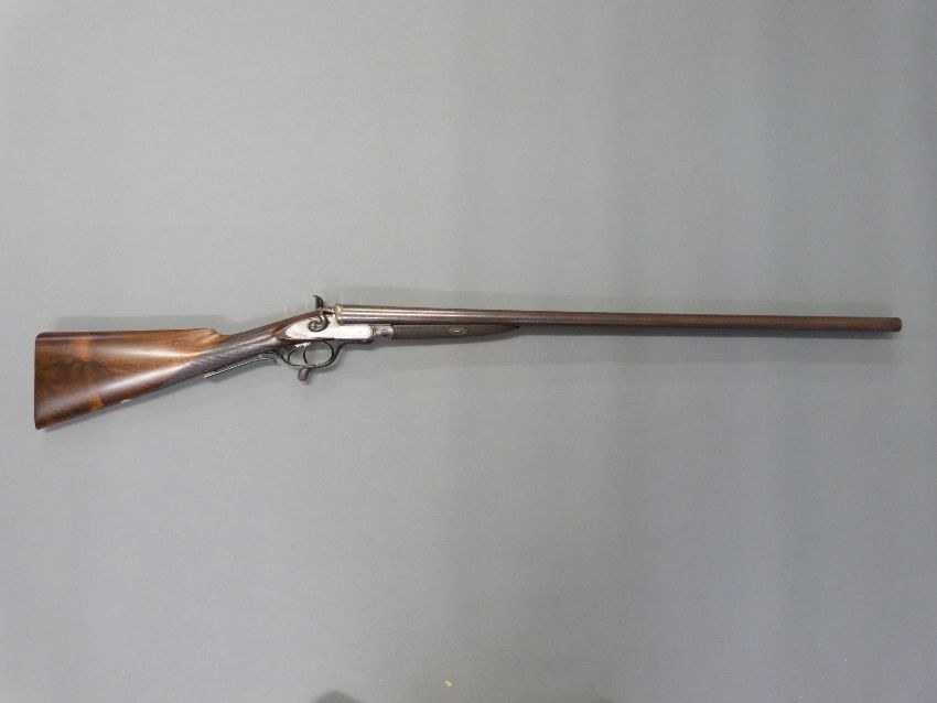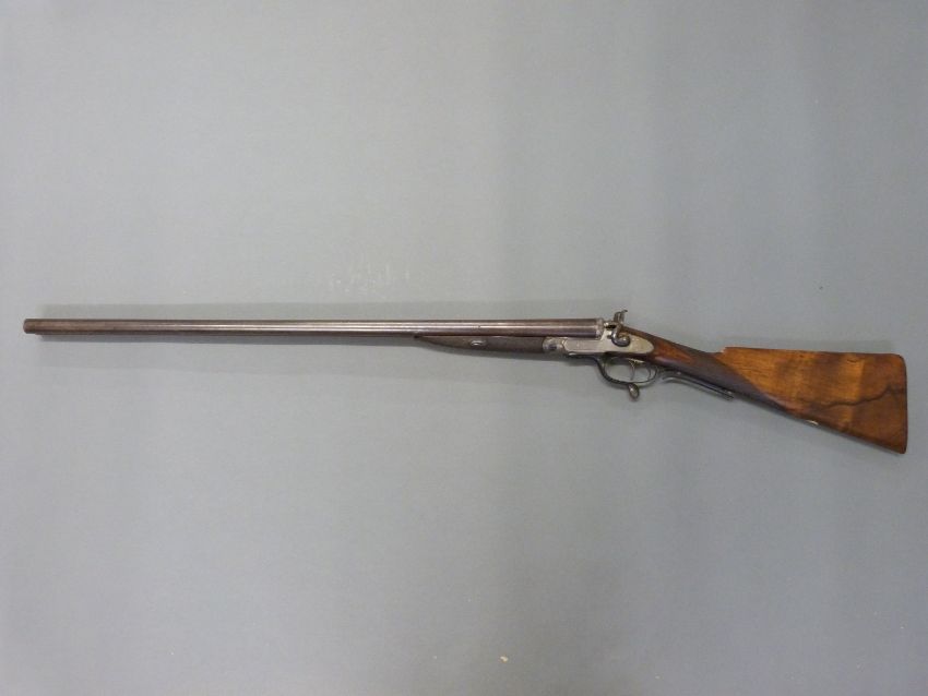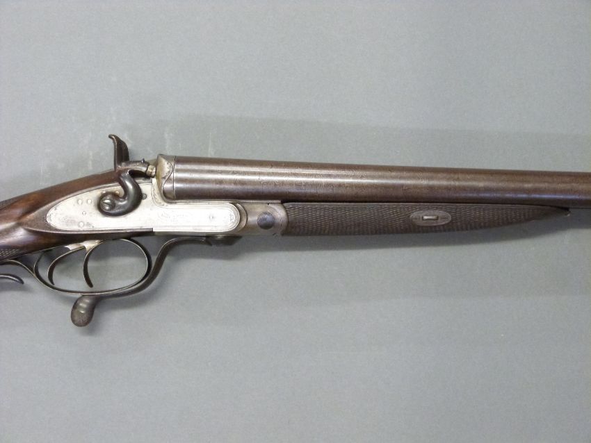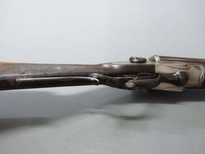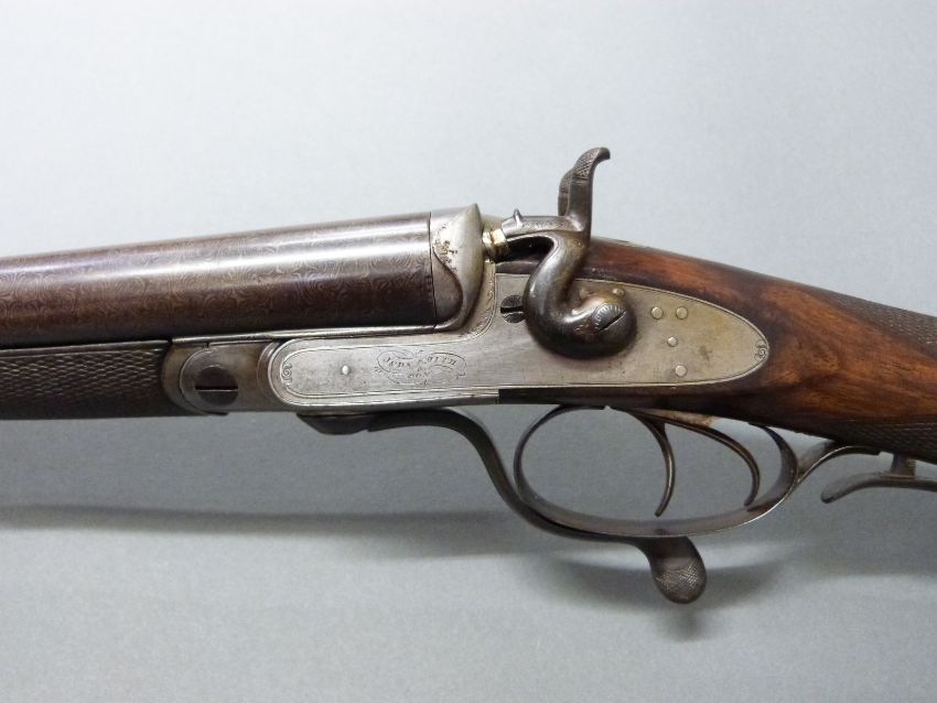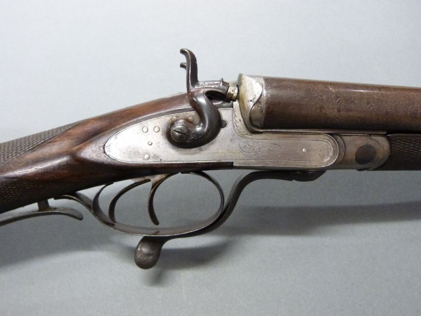 John Smith 12 bore side by side hammer action shotgun with named and engraved locks, chequered grip and forend, rotary underlever, double trigger, vacant cartouche to the underside of the stock, grip safety and 30 inch Damascus barrels, overall length 118cm , length of pull 36.5cm, NVSN. PLEASE NOTE THAT A VALID RELEVANT FIREARMS/SHOTGUN CERTIFICATE IS REQUIRED TO HANDLE/PURCHASE THIS ITEM.