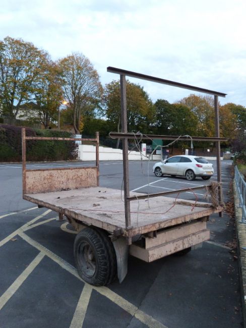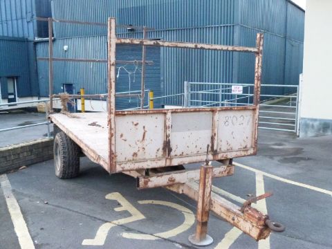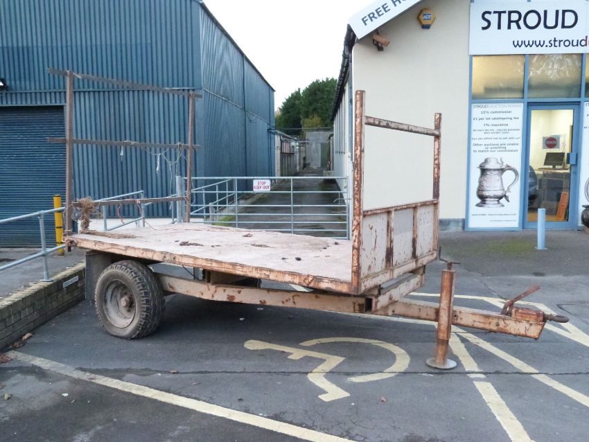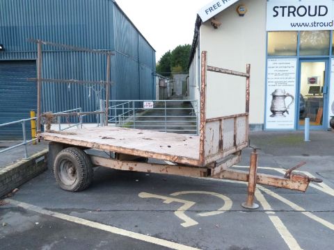 A Bradley D.E 60 single axle farm trailer with fixed front hay bar and removable rear frame, jack, brake and circular pick up hitch. Overall length 4.3m, length of bed 3.00m, width of bed 1.68m
