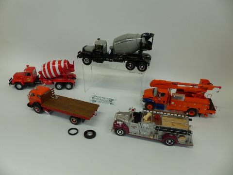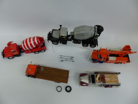 Five First Gear diecast model American construction and commercial vehicles including cement mixers, fire engine, cherry picker etc