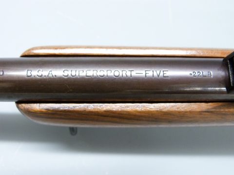 BSA Supersport Five .22LR bolt action rifle with sling suspension loops, adjustable sights, shaped stock, thumb slide safety and 22 inch named barrel, overall length 102cm, serial number 6153SB. PLEASE NOTE THAT A VALID RELEVANT FIREARMS/SHOTGUN CERTIFICATE IS REQUIRED TO HANDLE/PURCHASE THIS ITEM.