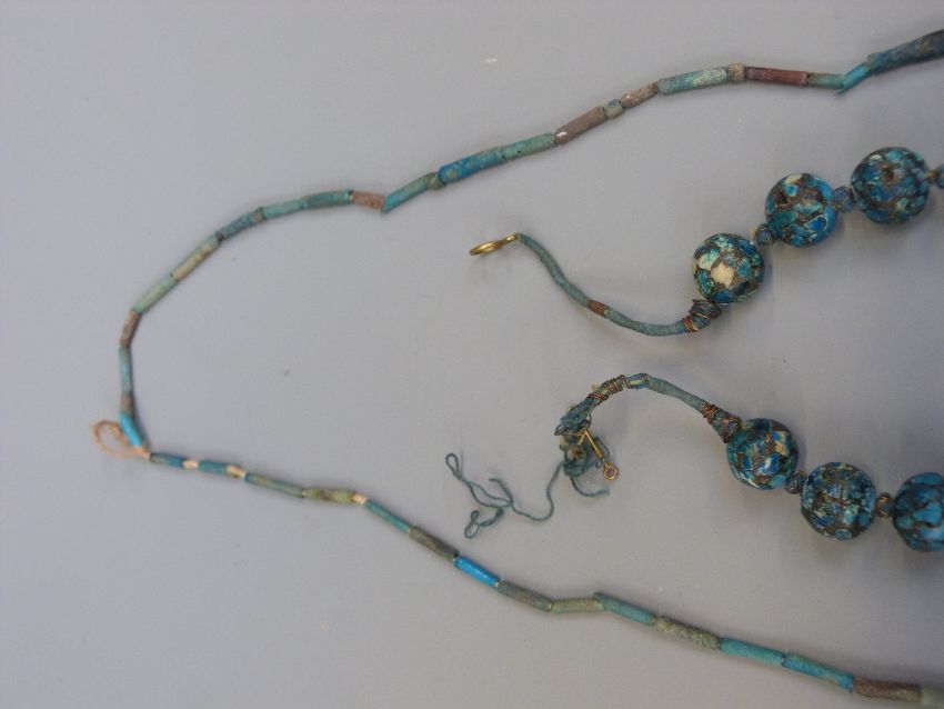 An ancient Egyptian faience beaded necklace and another similar, length 72cm together with a silver ring with an engraved dragon chasing a flaming pearl on a newer setting