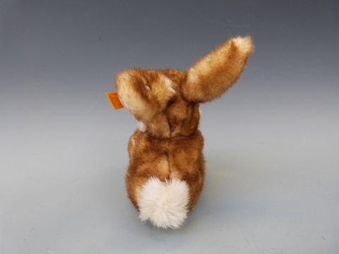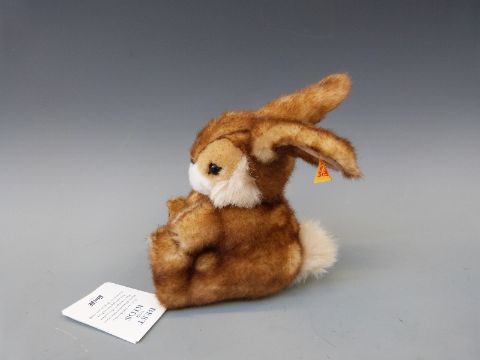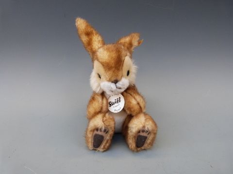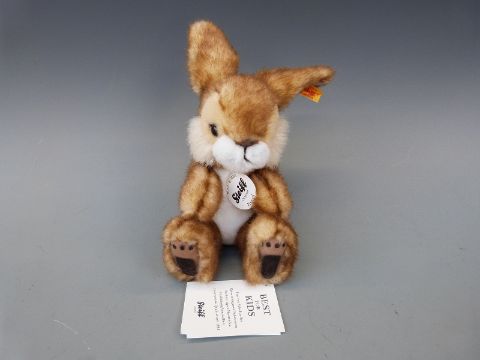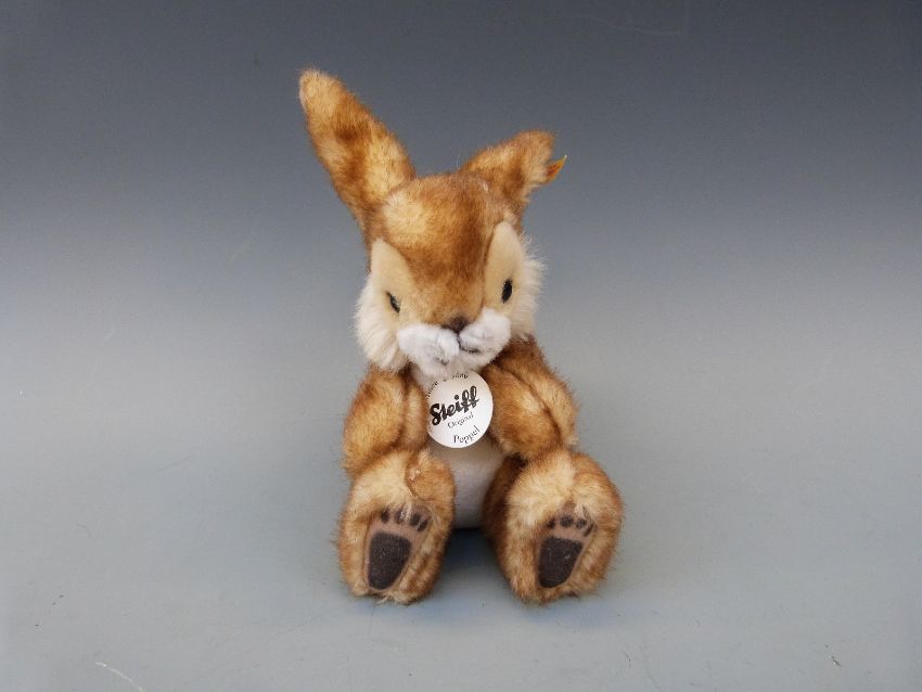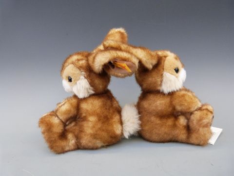 Two Steiff Teddy bears Poppel rabbits both with brown fur, white tails and noses and printed pads, 20cm tall