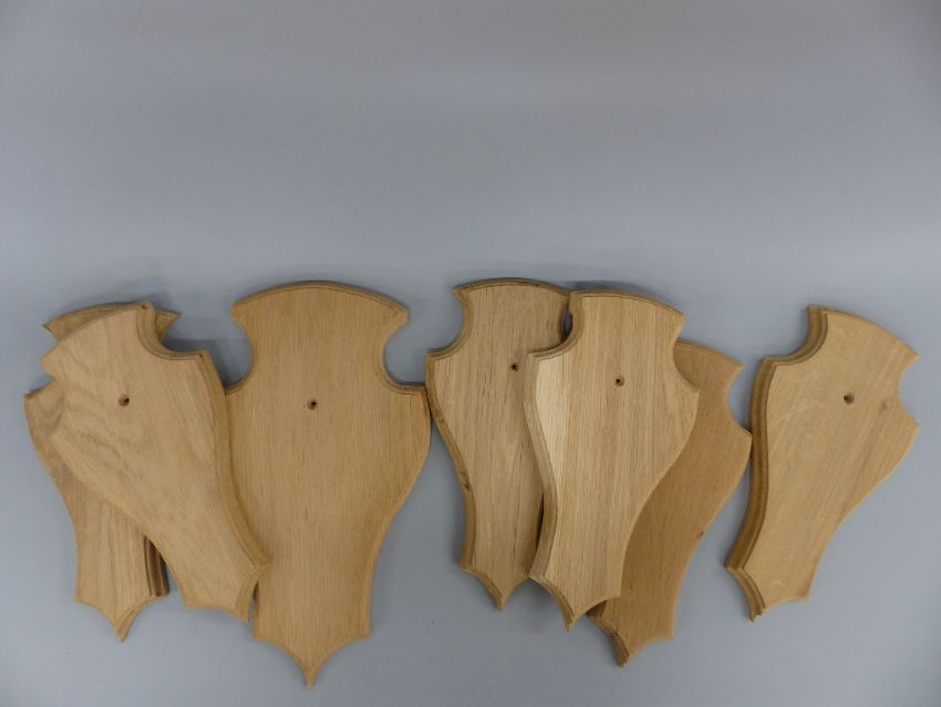Seven matching carved oak taxidermy shield mounts, one large 37x21cm and six others 31x15.5cm.