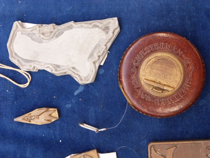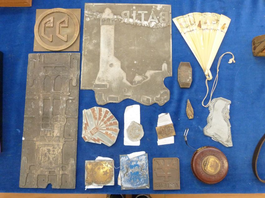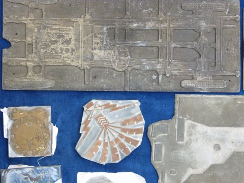 A collection of printing plates including over view of a vintage car etc, length 30cm