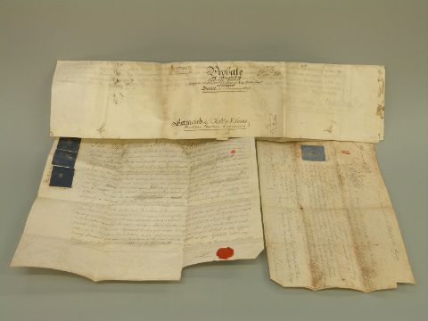Three documents on parchment relating to Captain George Dunn, paymaster of the 23rd Regiment of Foot/Royal Welsh Fusiliers comprising commission to Ensign into the Somerset Regiment of Military dated 1806, commission to Captain in the 23rd Foot/Royal Welsh Fusiliers dated July 1815 and probate of the will in which Captain Dunn bequests his Waterloo medal to his nephew.