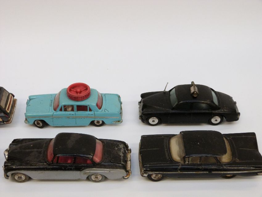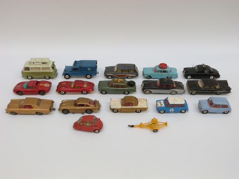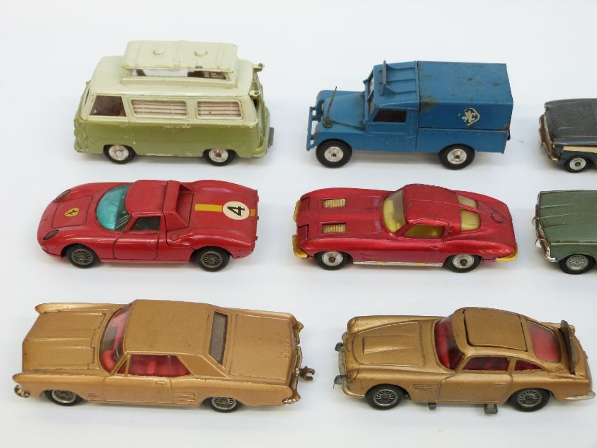 Seventeen Corgi Toys diecast model vehicles including James Bond 007 Aston Martin, Mini Coopers, RAC Land Rover etc