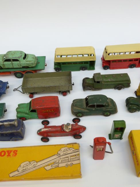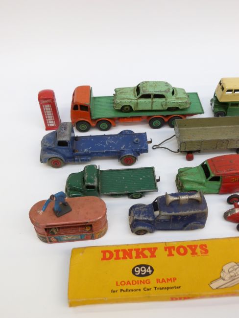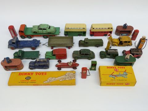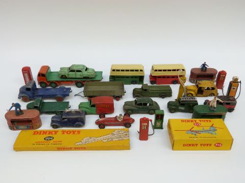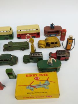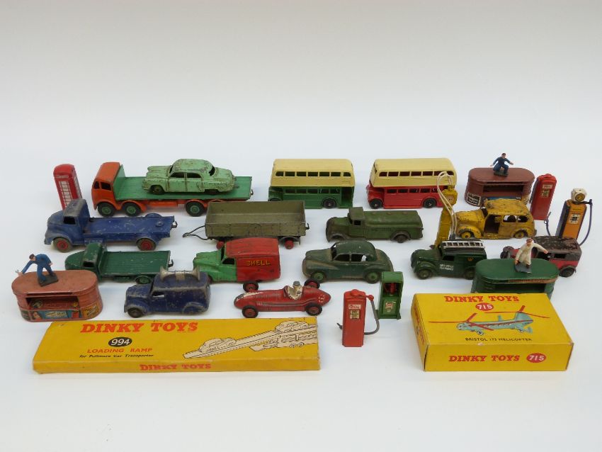Twenty-six Dinky Toys and Supertoys diecast model vehicles and accessories including Foden Flatbed Lorry, Double Decker Buses, Loudspeaker Van, Post Office Telephones Van Bristol 173 Helicopter, Petrol Pumps etc, some in original boxes.