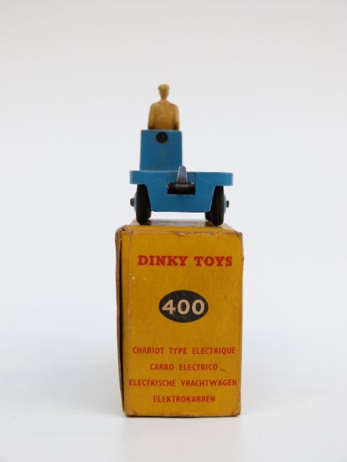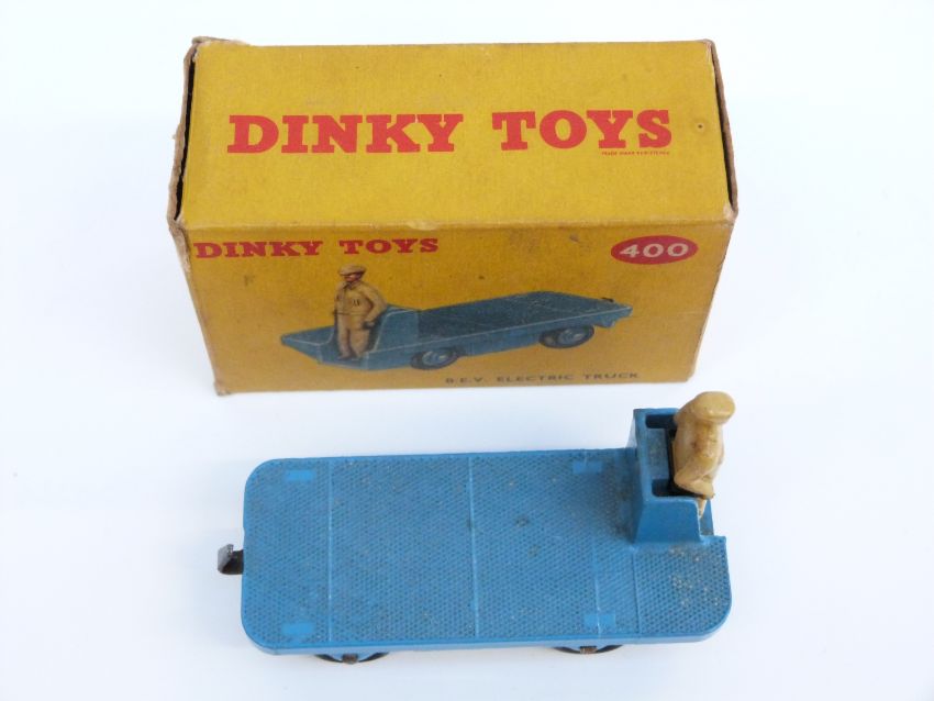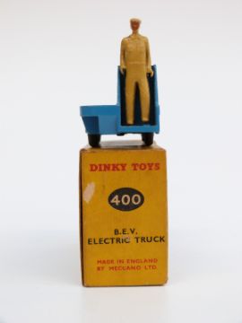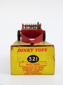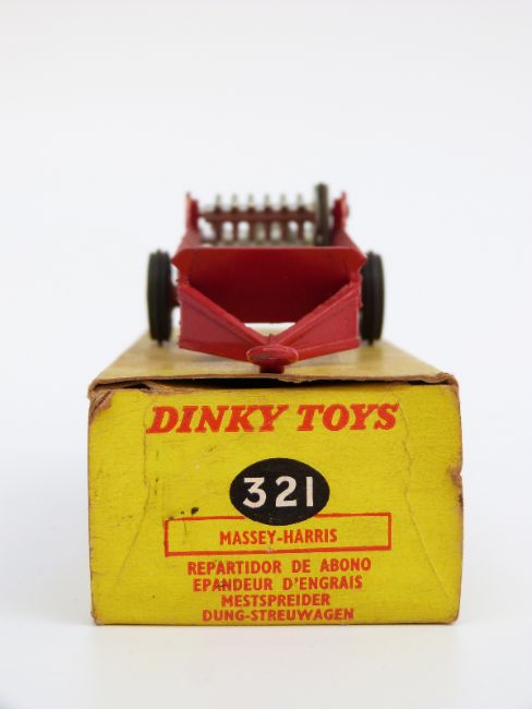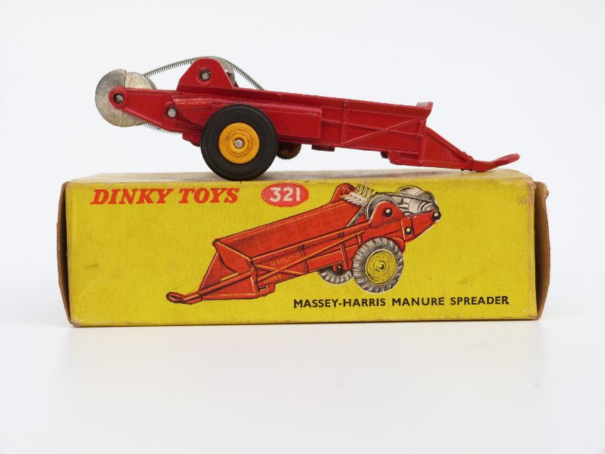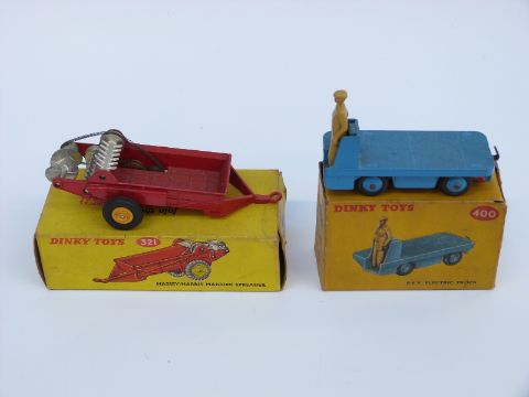Two Dinky Toys diecast model vehicles Massey-Harris Manure Spreader 321, and BEV Electric Truck 400, both in original boxes