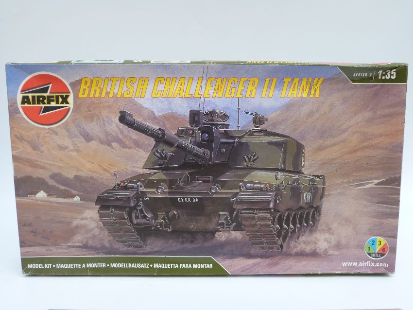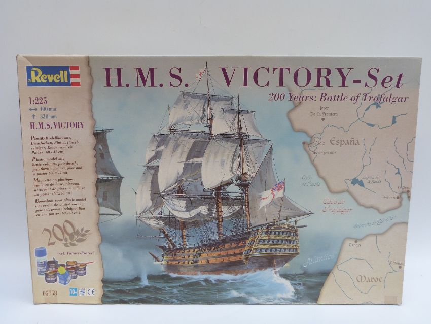 Three Airfix, Revell and Academy model kits HMS Victory Set, British Challenger II Tank, and The 'Ghost' of Baghdad Lockhead F-117A Stealth Attack-Bomber, all in original boxes, some sealed