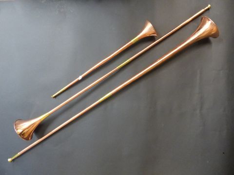A set of three graduated copper coaching horns with brass fittings